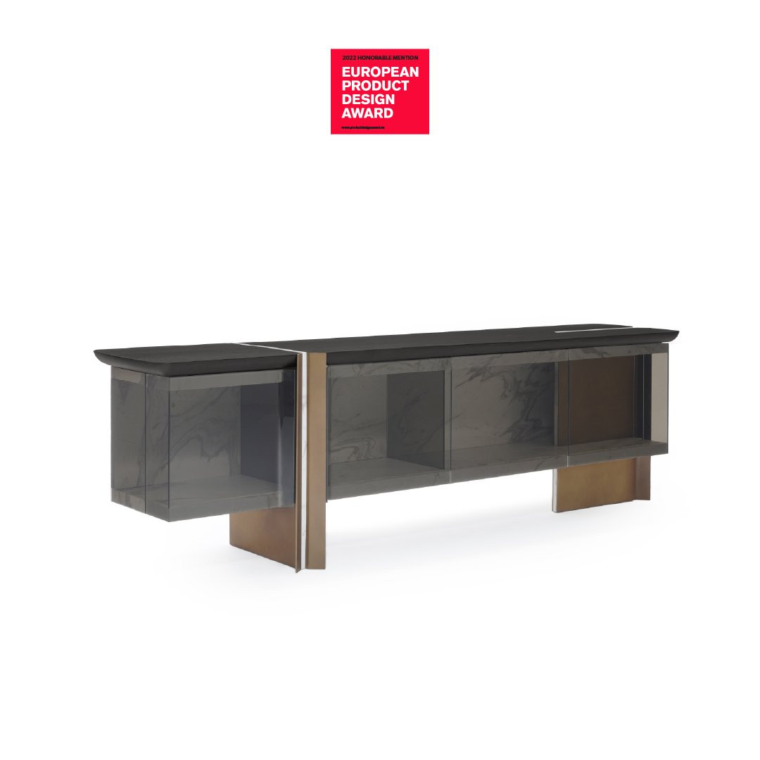 Das Foil Sideboard, das den aktuellen Einrichtungstrends entspricht, ist ein Gerät mit doppelter Funktion: Sideboard und Vitrine in einem. Ein fast aphonischer, maximalistischer Ansatz beherrscht das Design und macht es zu einem wahren Meisterwerk. Der Glasbehälter mit der schlanken Marmorrückwand und der geschliffenen Massivholzplatte wird durch mitreißende industrielle Elemente gestützt und verstärkt. Die zeitgenössische Eleganz kommt durch die Metallbeine zum Vorschein, die zart mit Marmorstreifen verkleidet sind. Die gebogenen Glastüren passen sich perfekt an die äußere Neigung der Metallschwalbenschwanzsäule an und verdeutlichen die bemerkenswerten handwerklichen Fähigkeiten der türkischen Glasbläser. Der Schrank ist mit einer ferngesteuerten LED-Beleuchtung ausgestattet. Mit den Akzentgläsern in Schiefer und Bronze erhält die Vitrine einen kräftigeren, gewichtigeren Charakter.