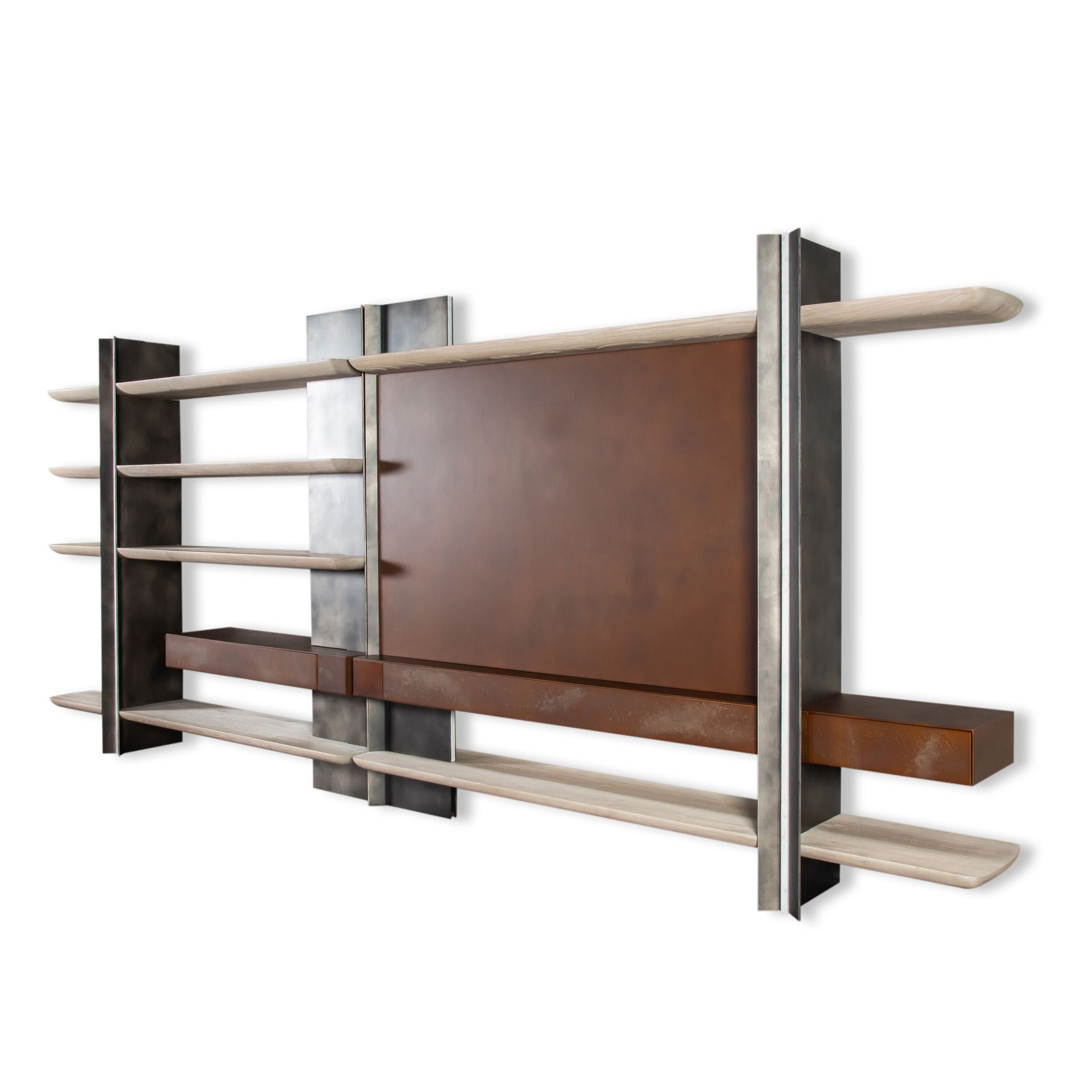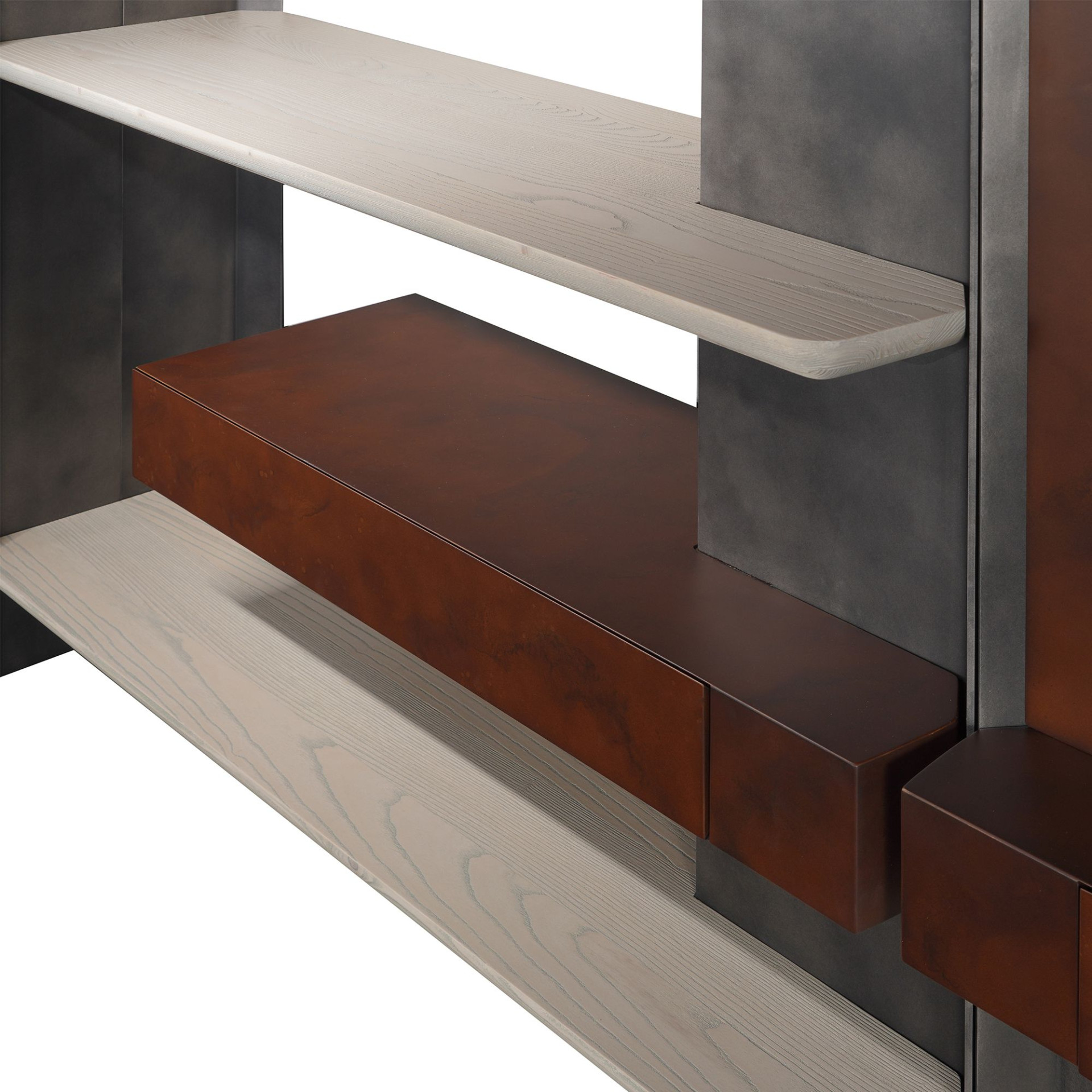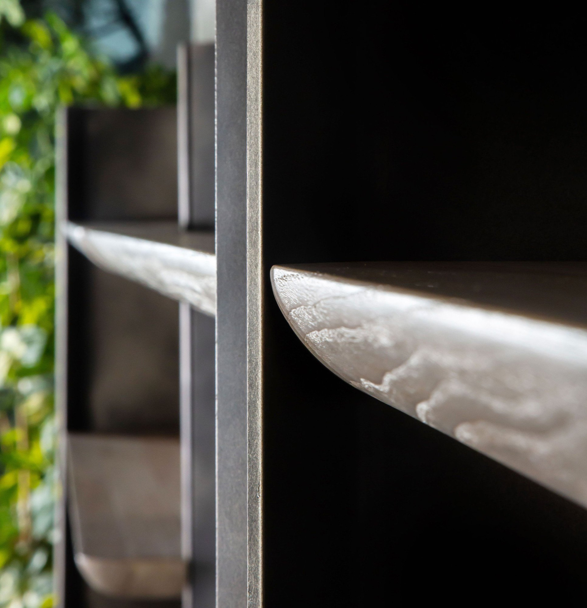 Das mit einer Rückwand aus furniertem Holz und schwebenden Schubladenmodulen ausgestattete Discovery TV Unit ist eine illustrierte Version des Discovery Bookshelf, das mit seinen voluminösen geschliffenen Massivholzböden für Aufsehen sorgt. Die furnierten Holzelemente sind auch in Metallic- oder Lackausführung erhältlich, die Metallpfosten in gebürsteter Ausführung für zusätzliche Textur, und die große Auswahl an Farbtönen ermöglicht zahlreiche individuelle Konfigurationen und Lösungen.