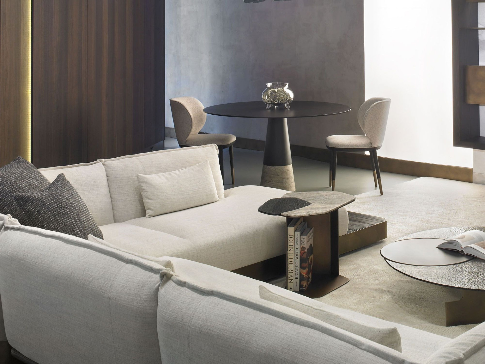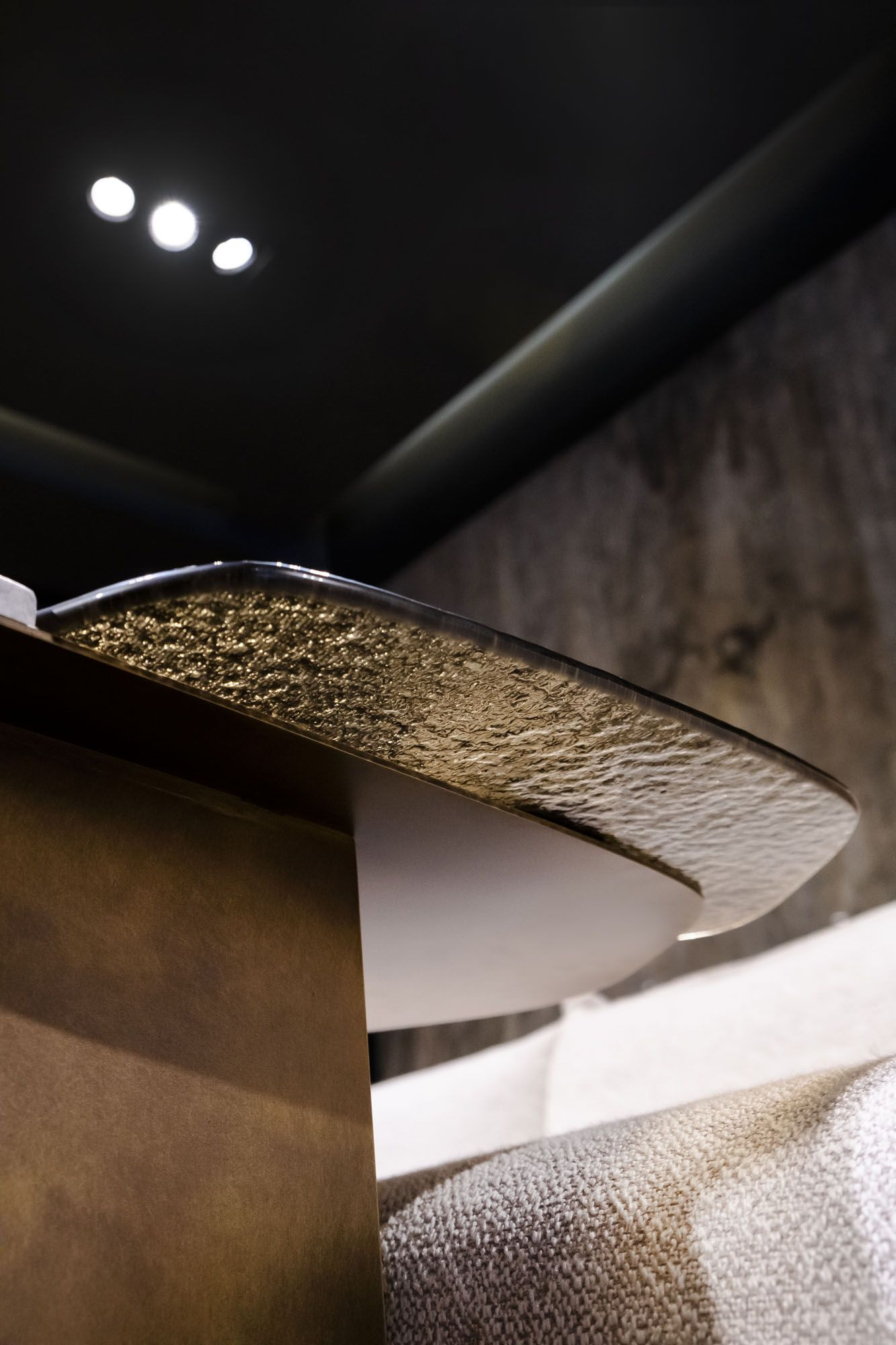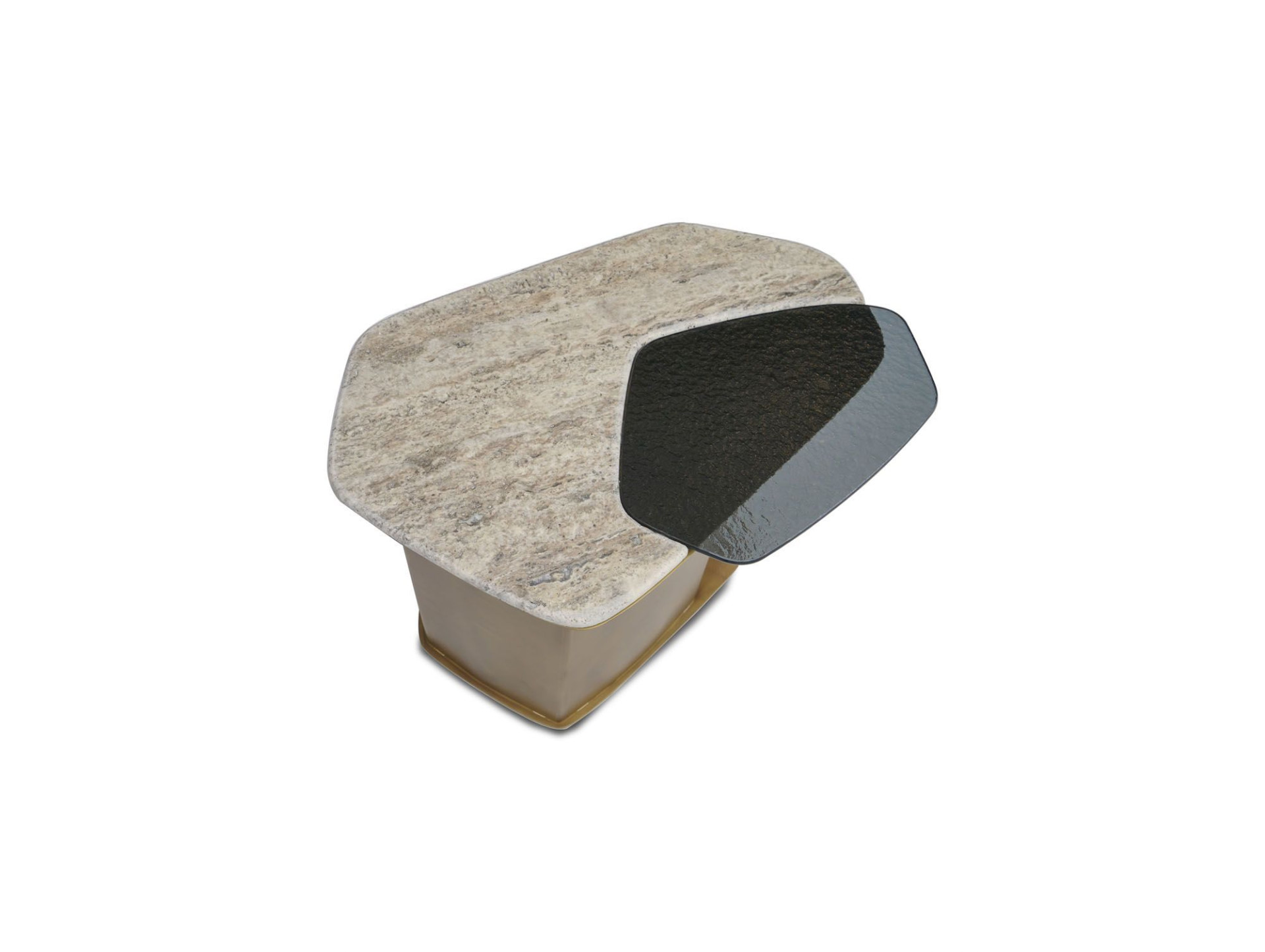 Der Beistelltisch Stratos entsteht aus der Harmonie von Travertin, Fusionsglas und Metall.
