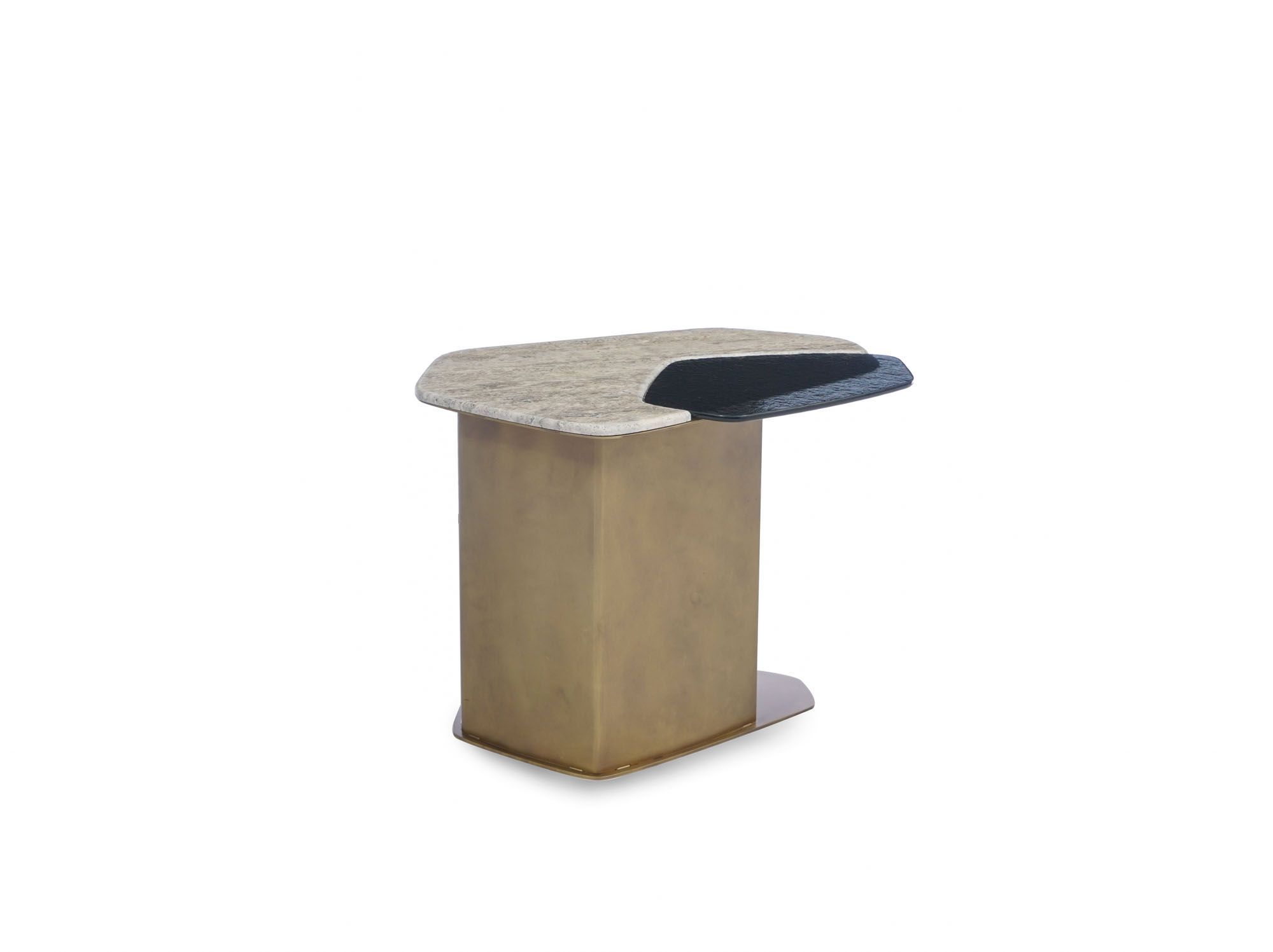 Stratos side table, which consists of the harmony of travertine, fusion glass, and metal standing in front of a white background.