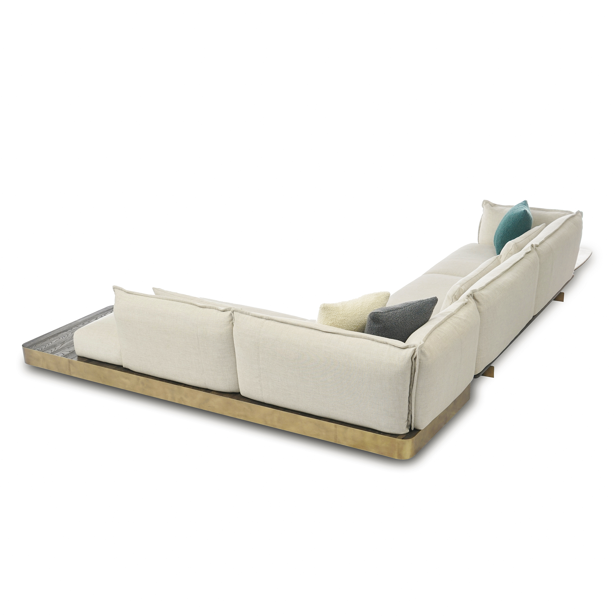 Machen Sie Platz für Komfort und Eleganz in Ihrem Leben. Das Stratos-Sofa kombiniert dunkle Eiche in Risskastanie mit Metall, Travertin, Schmelzglas und dem Komfort von Gänsefedern und bringt so originelle Linien und Komfort ins Leben.