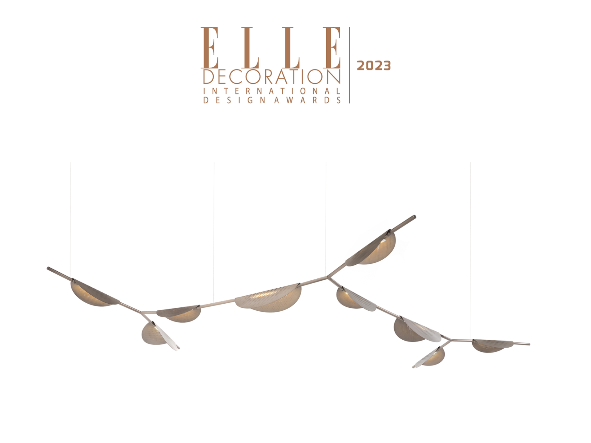 An influential tribute to the modularity and flexibility of the mother earth, the Half Moon Light consists of tubular LED strips that hide behind leaf-like shades tied to a metal rod frame reminiscent of a branch. Perforated sheet metal shades come in two sizes and various colors. Once attached to the rods, they can easily be tilted to change the direction of the light. Available in pendant, floor and wall lamp, and table lamp options, Half Moon Lighting System brings hefty artistic essence to any interior space, whether used as a large installation or a single unit lighting. The table and floor lamp come with circular marble bases. The modular hanging frame is available in two, three, or five shaded versions and a straight or crooked linear body, fit to accompany a rectangular dining/ meeting table. Suitable for hotels, restaurants, showrooms, or any other public space, as well as private living and dining rooms.