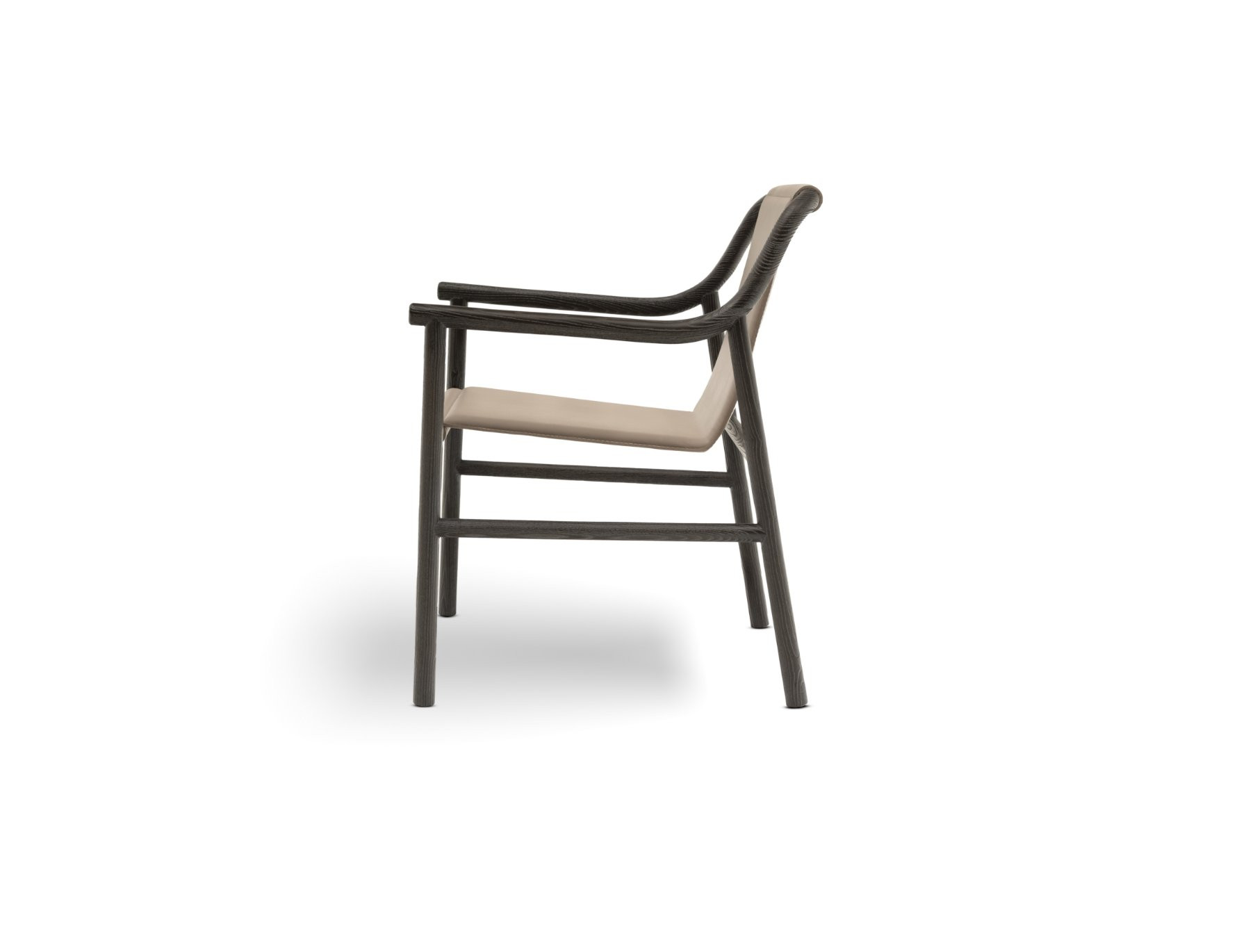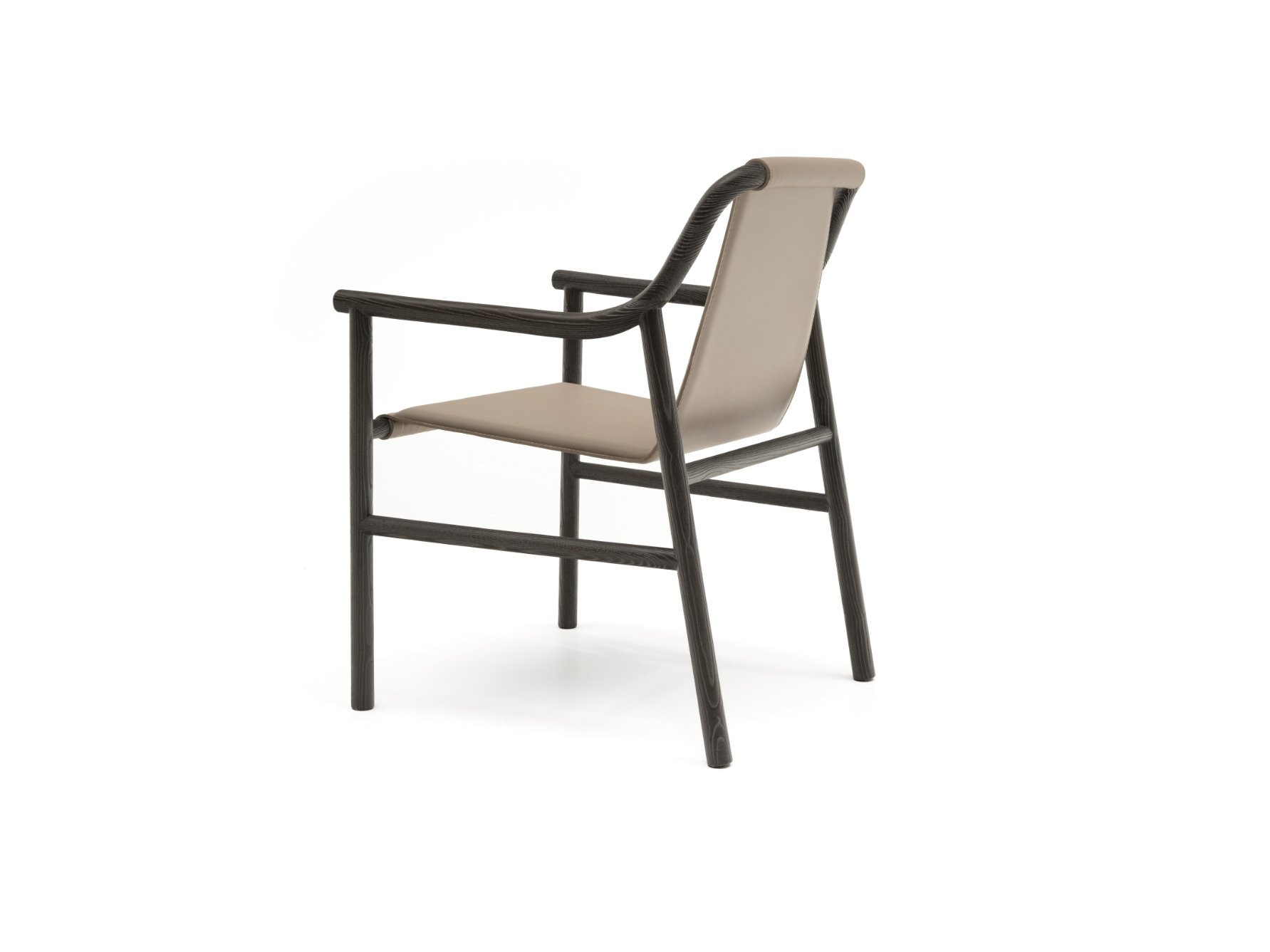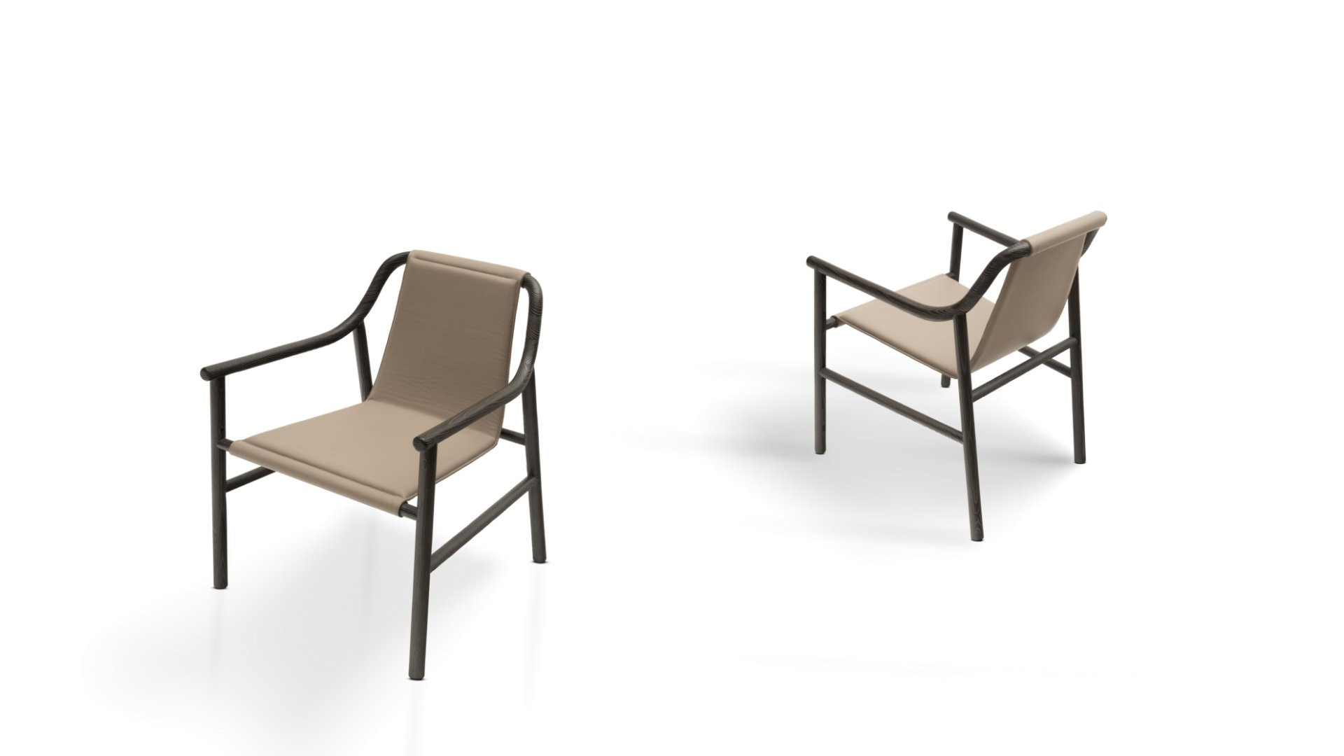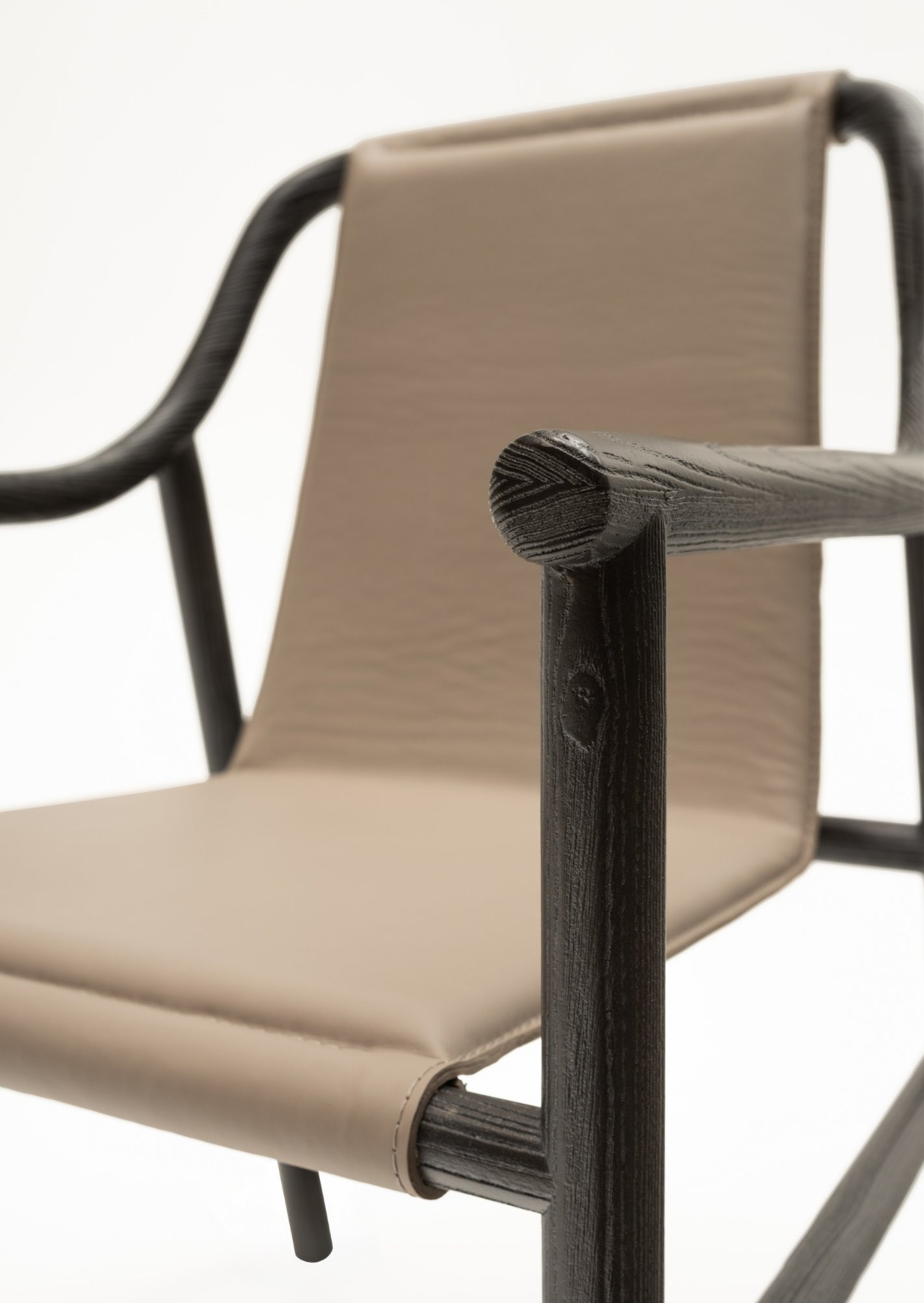 A contemporary chair with a sculptural wooden frame and a suspended leather seat, expressing a raw yet refined character through essential lines and tactile materials. Balanced proportions meet an earthy sense of elegance.