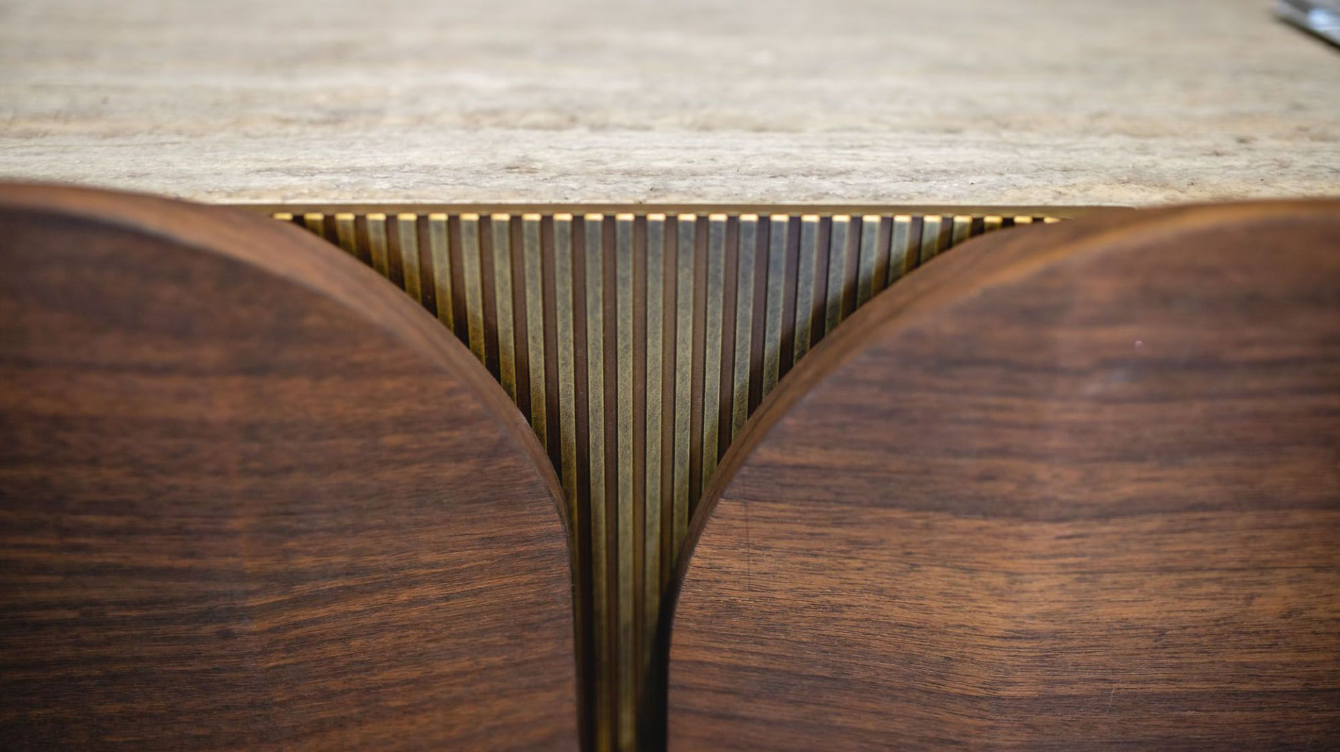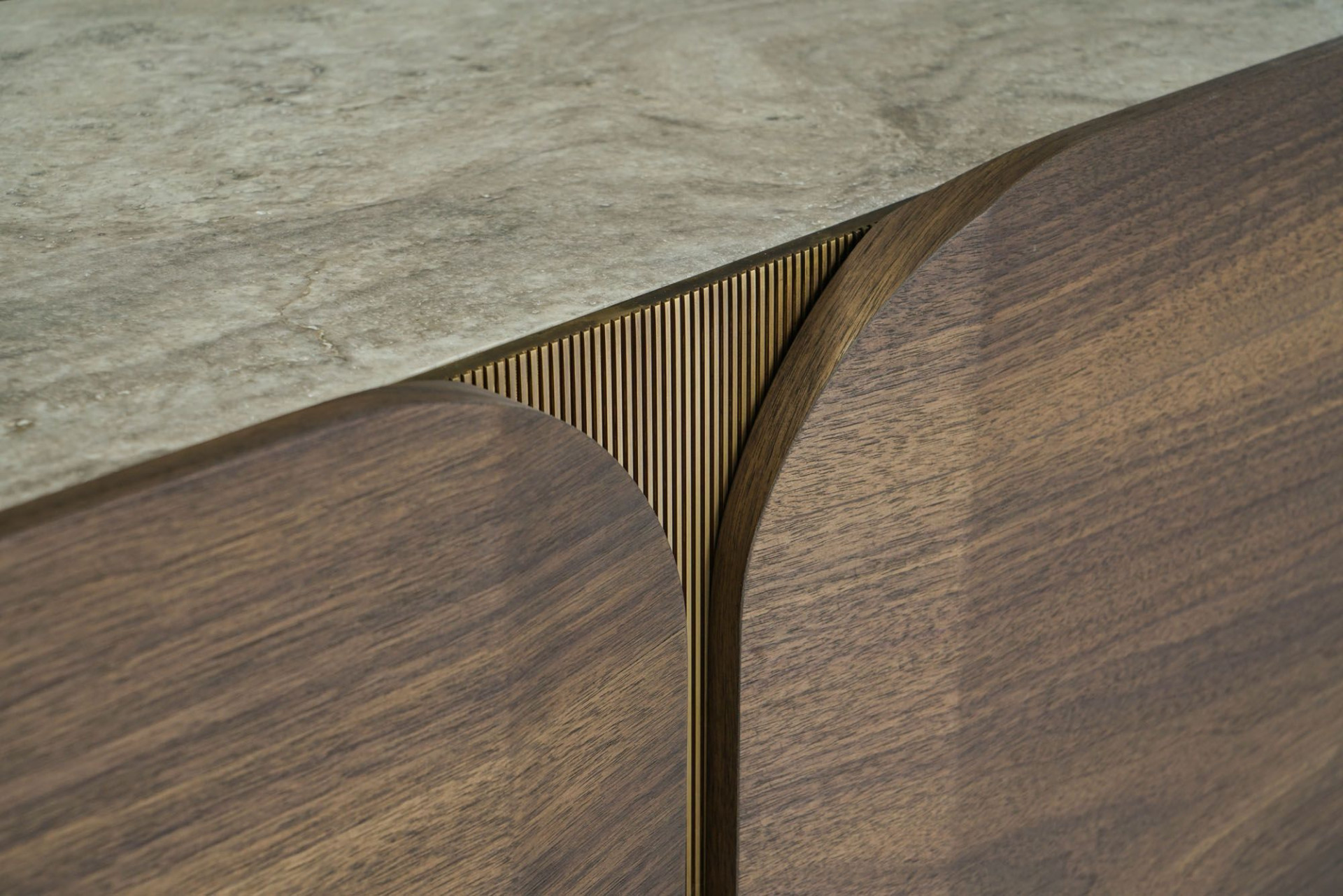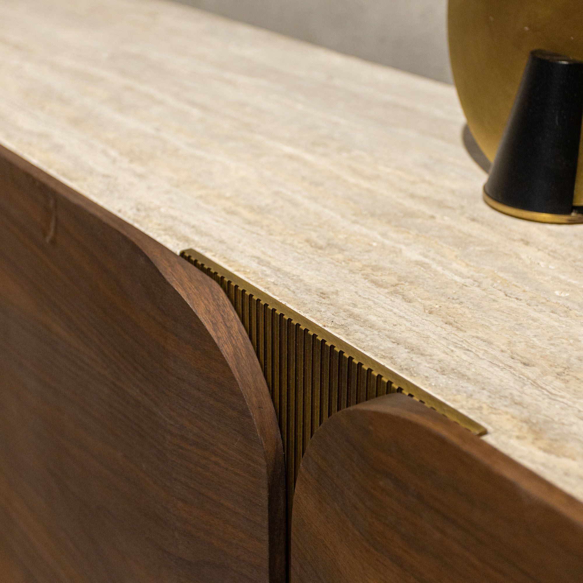 Boji Sideboard in which aged brass meets with travertine marble reshapes unique forms of nature with modern lines.