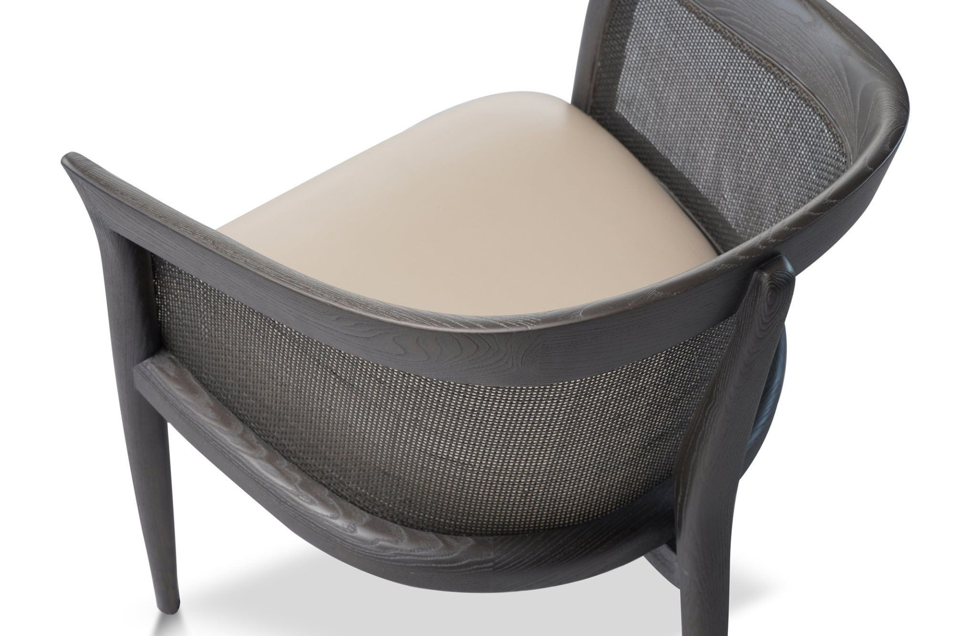 Widely practiced in the 60'ies & the 70'ies, a three-legged chair is considered a wonder of physics. It poses stably on any uneven surface, as the tips of the legs always touch the same geometric plane. Cordelia Chair is the outcome of a refreshed design approach applied to a much older, classic, formal seating unit; a solid wood-framed Tub chair. The angular rear legs of the traditional design turn into one vertebral support that climbs through the one-piece crescent backrest/ armrest with a rattan inset. The enveloping structure of the solid wood chair displays the genuine craftsman skills of Enne. A proper companion for a dining or meeting table, its compact and lightweight nature makes it the ideal seat for any interior space. The sanded solid wood and the rattan inset come in various colors.