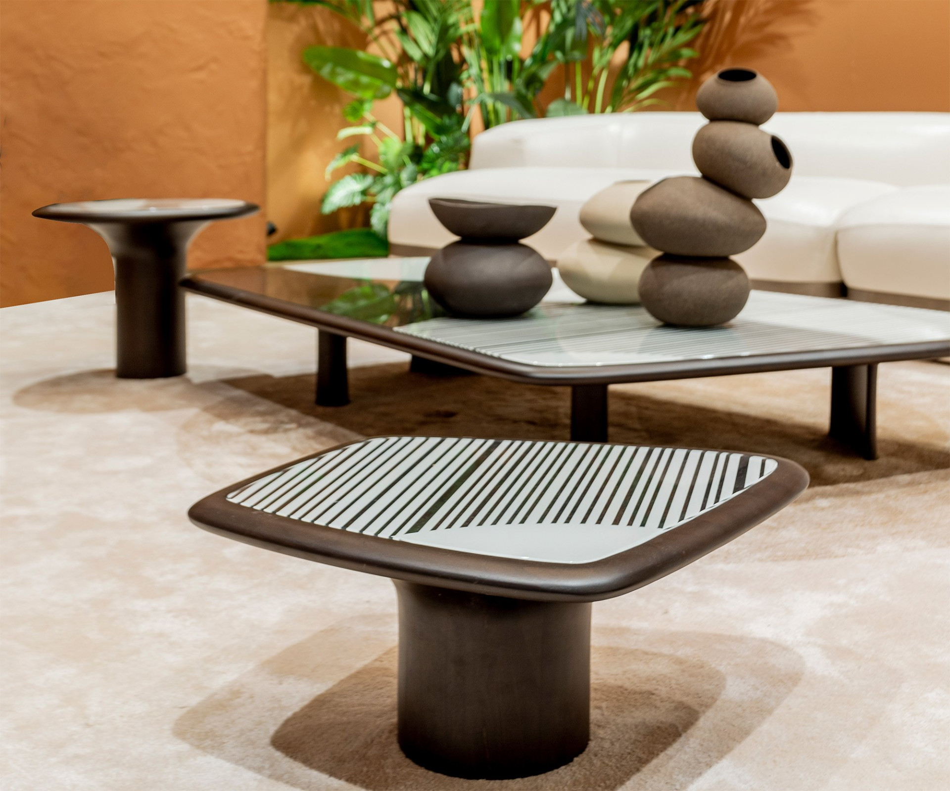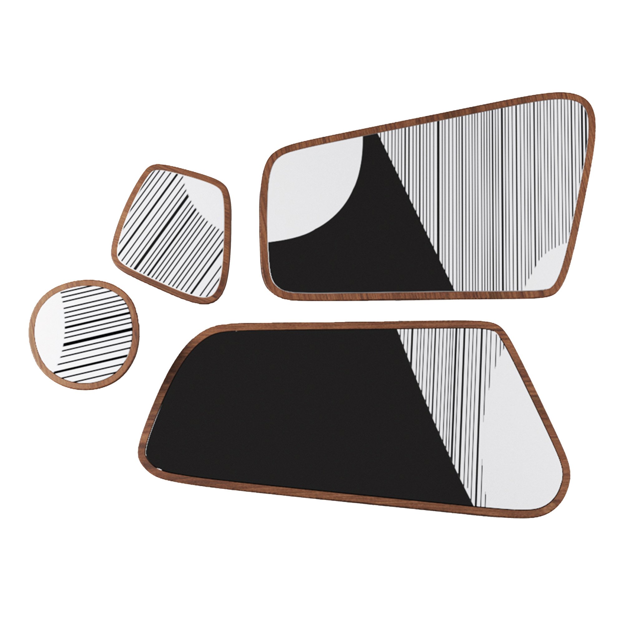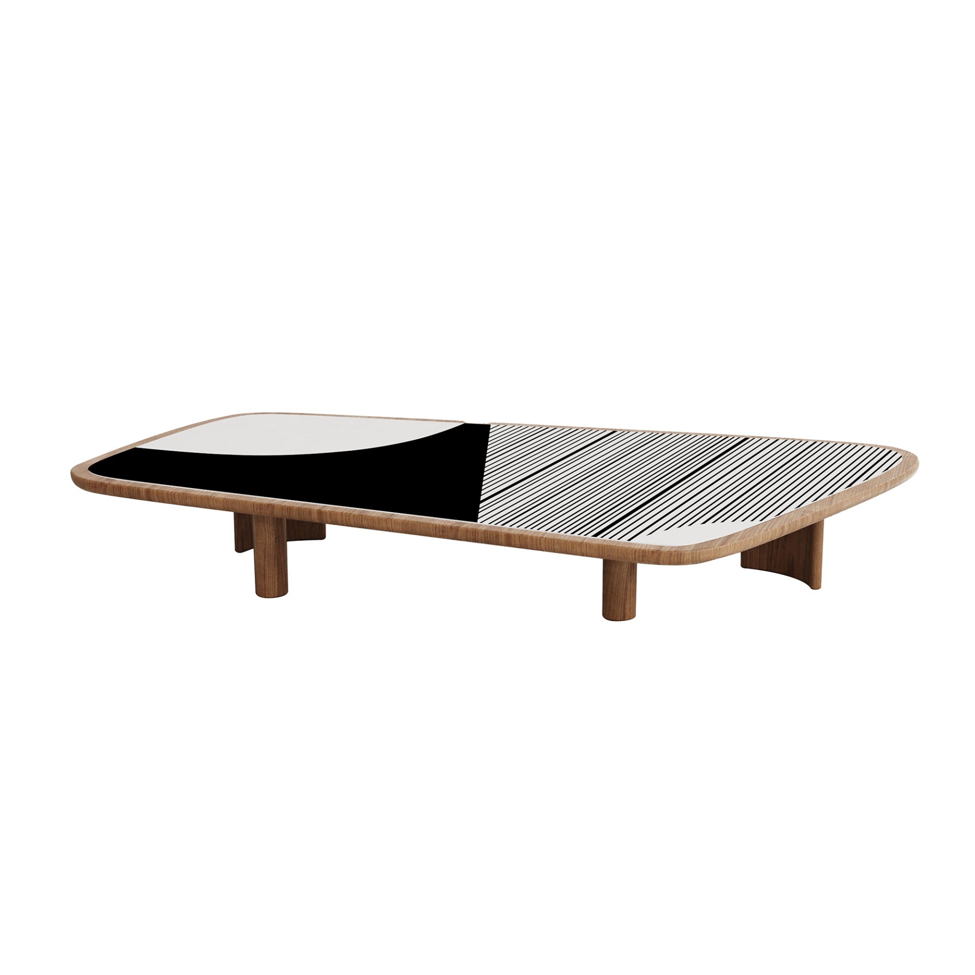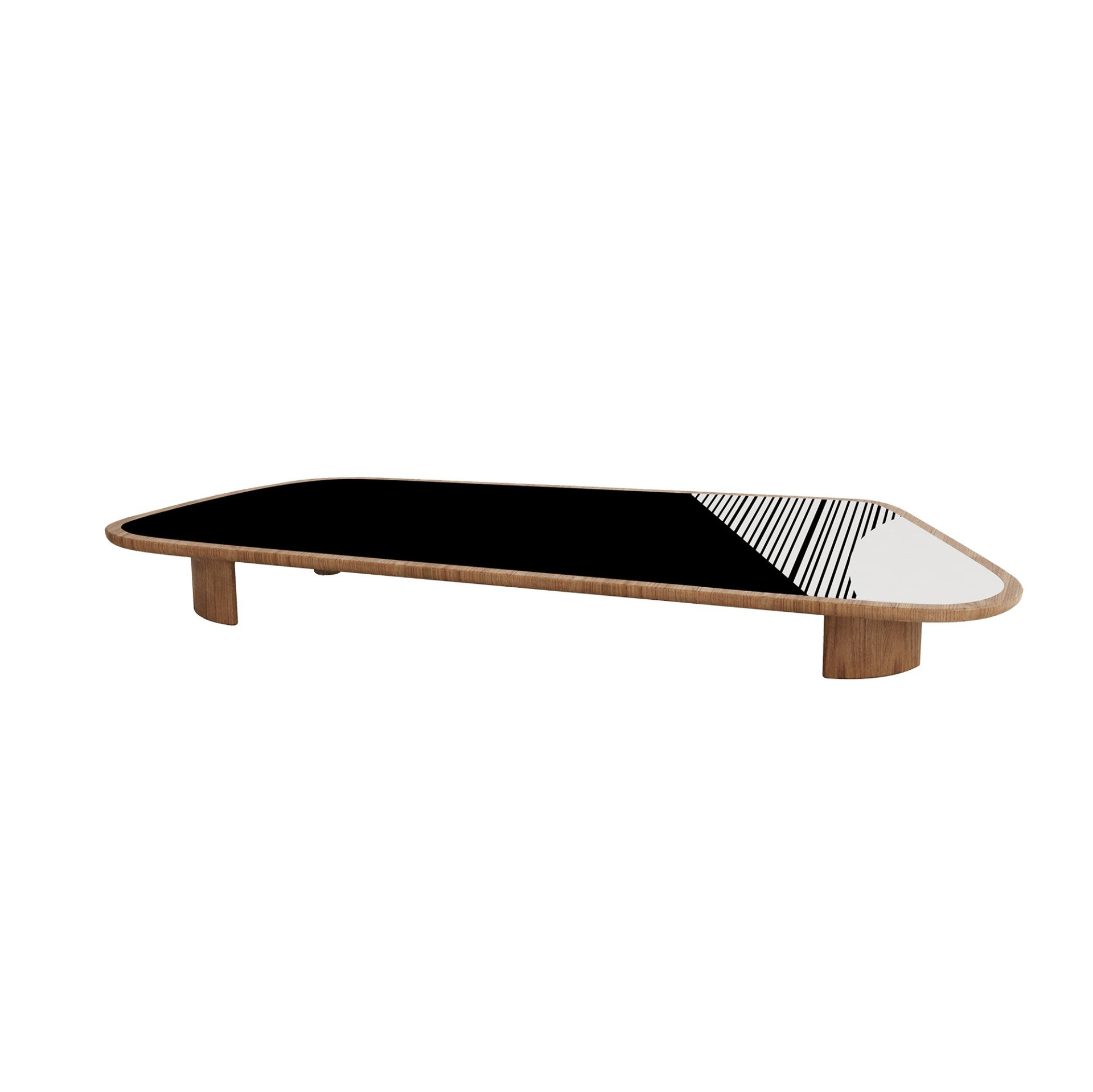 Based on the multi-patterned Afro-Bohemian style of the 70s but identified with today's warm minimalism approach, which promotes clean, clutter-free, yet welcoming, cozy, and liveable spaces, Holly Coffee Table comes in four different forms and sizes. Black and white graphic printed glass placed on a solid walnut body with various varnish alternatives initiates the tone of the design. There are four alternative patterns determined by the designer. Side tables emerge as abstracted mushrooms and coffee tables as amorphous rectangles. Holly Coffee Tables can be used individually or clustered in the middle of any furniture set to create fair focal points in any space. Perfect choice for home, office, hotel, and any lounge/ waiting area.