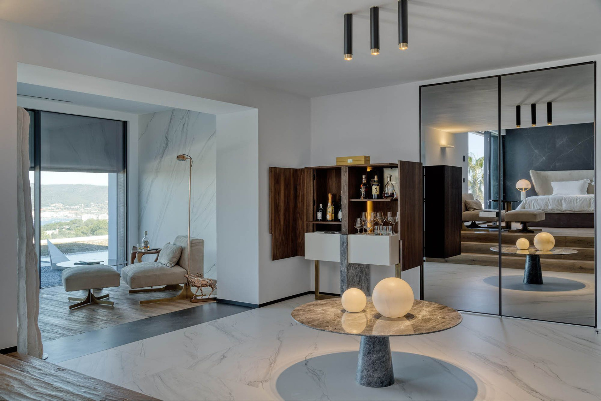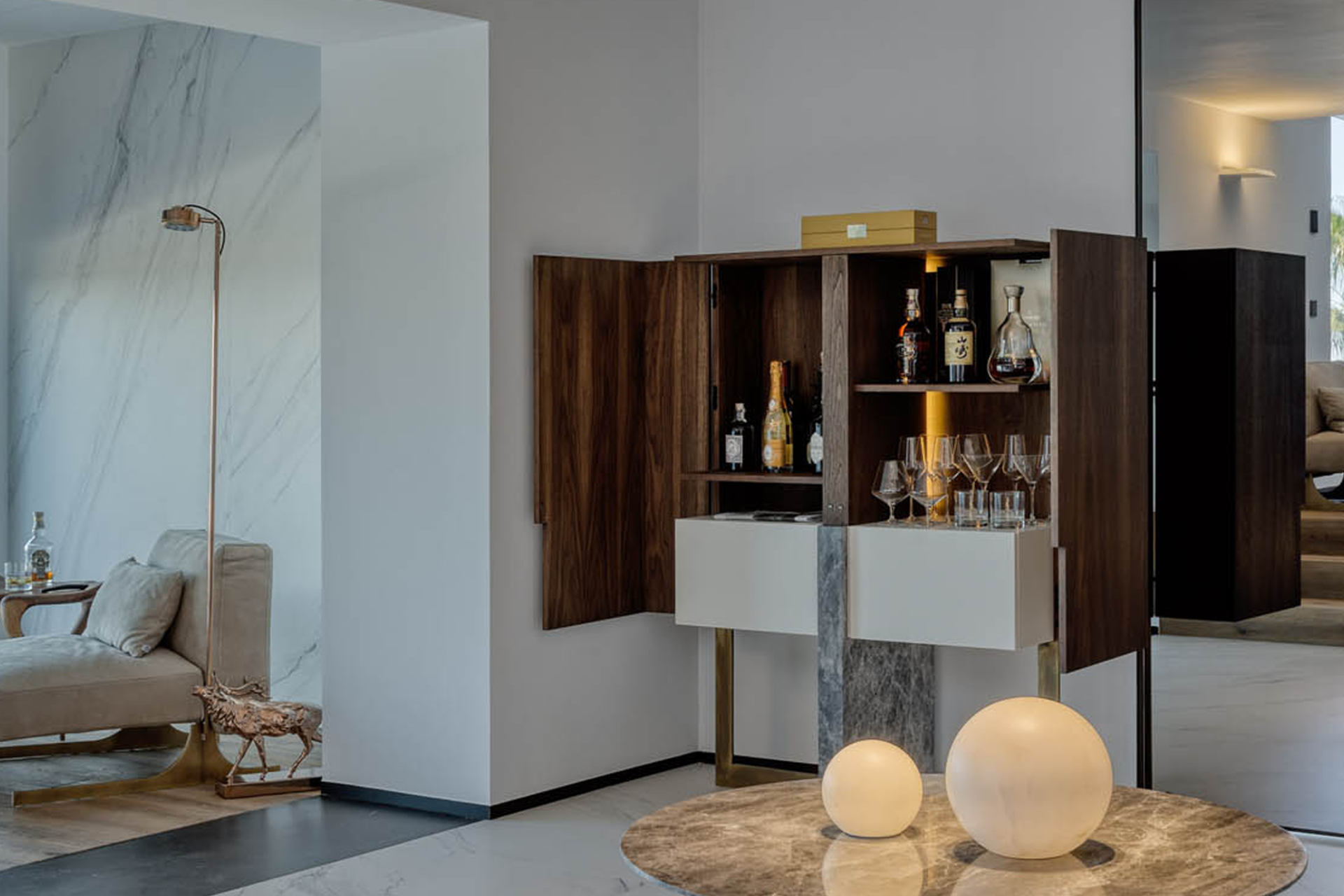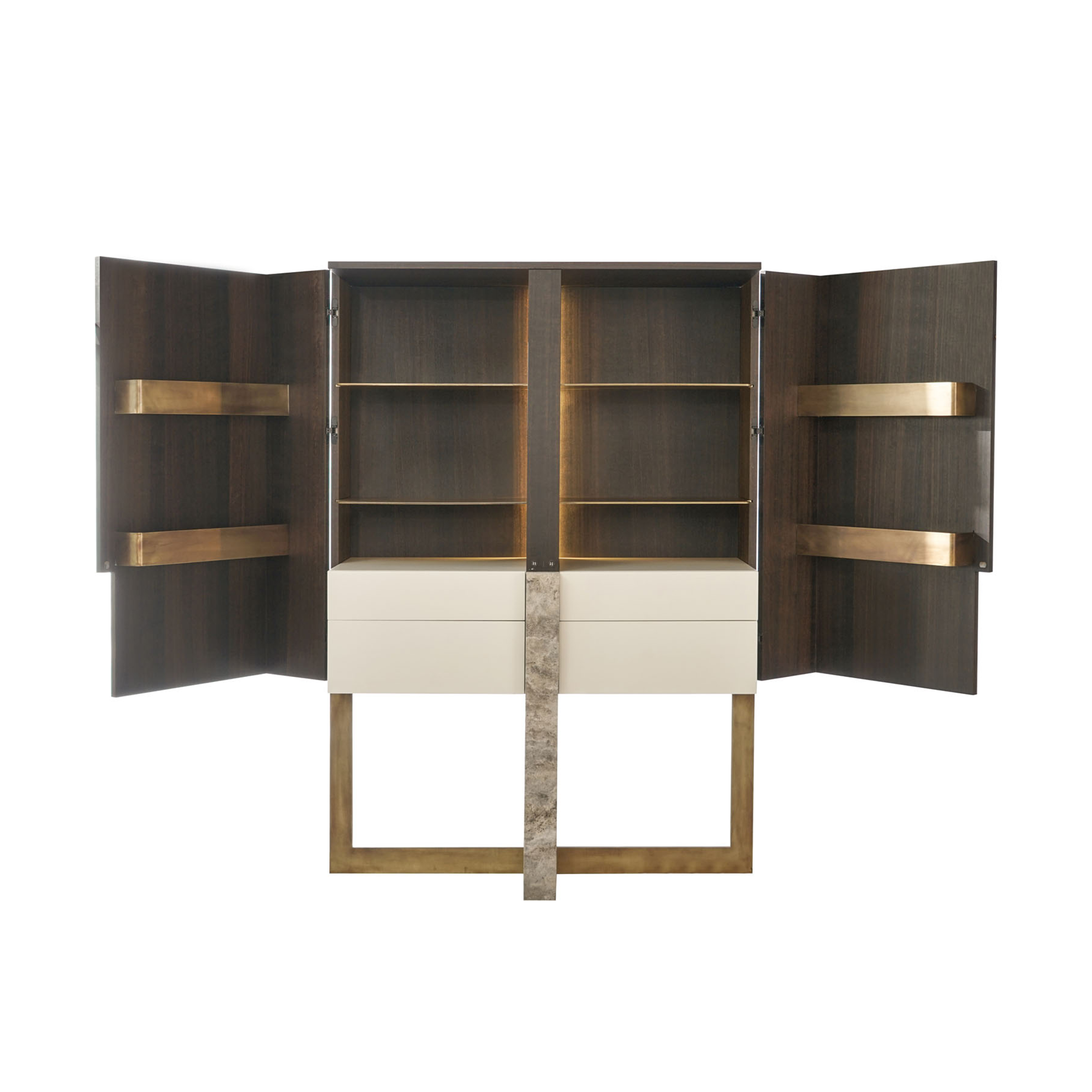 Inca Cabinet which meets American walnut-covered surfaces, travertine lacquered drawers with LED lightings reflects the light of creative ideas to exceptional lines of the design.
