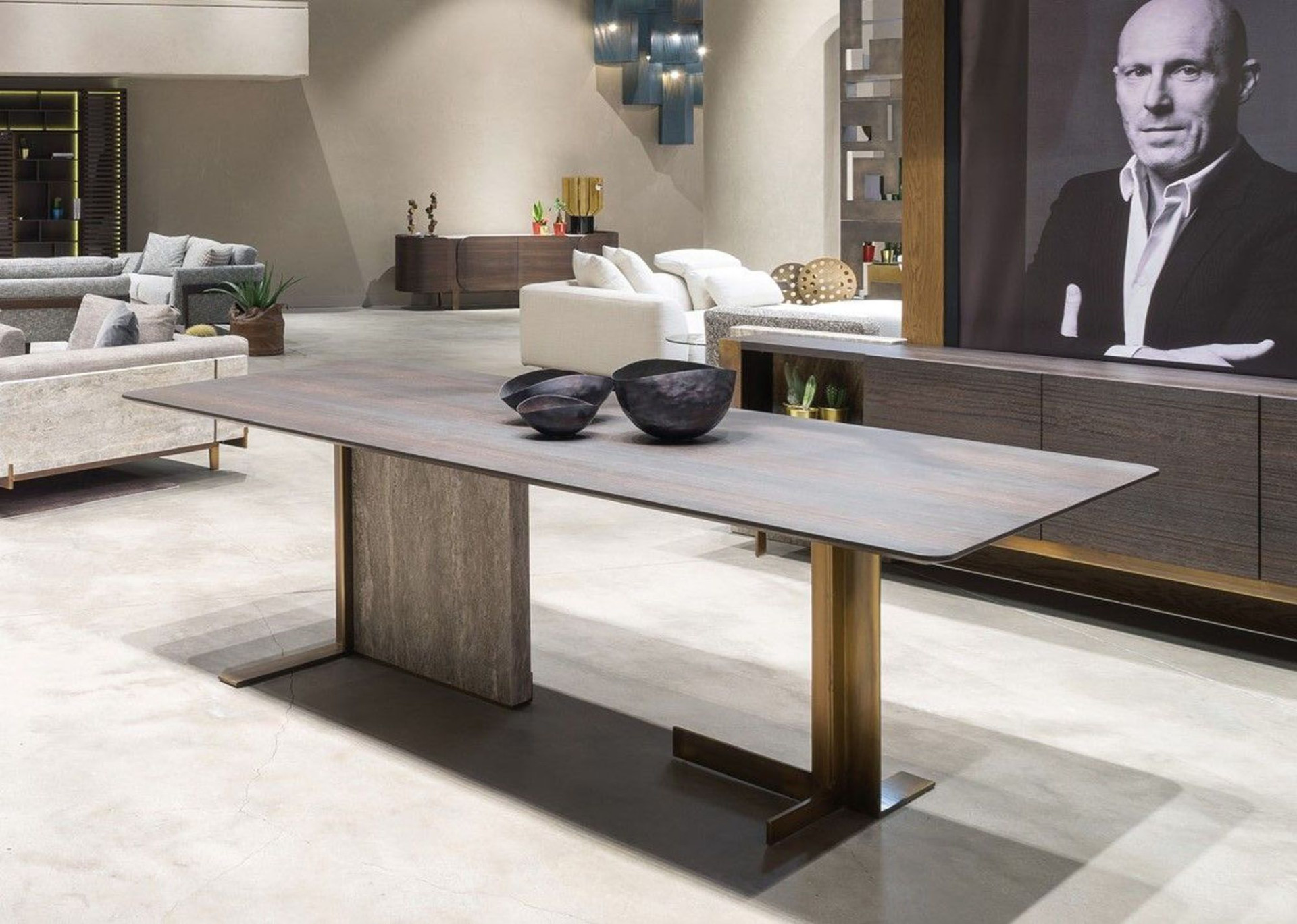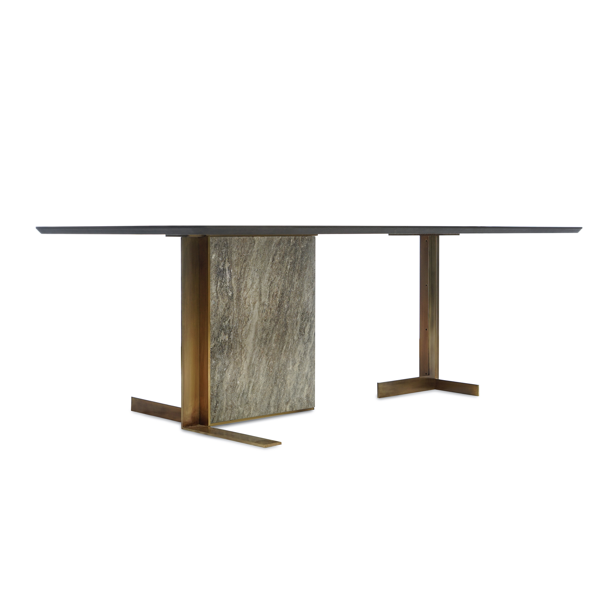 Life is the architect of the most unique forms. Inca Table in which eucalyptus covered surfaces gives life again to the unmatched forms of nature in modern lines. The harmony of aged brass with travertine marble is shaped in characteristic and modern lines.