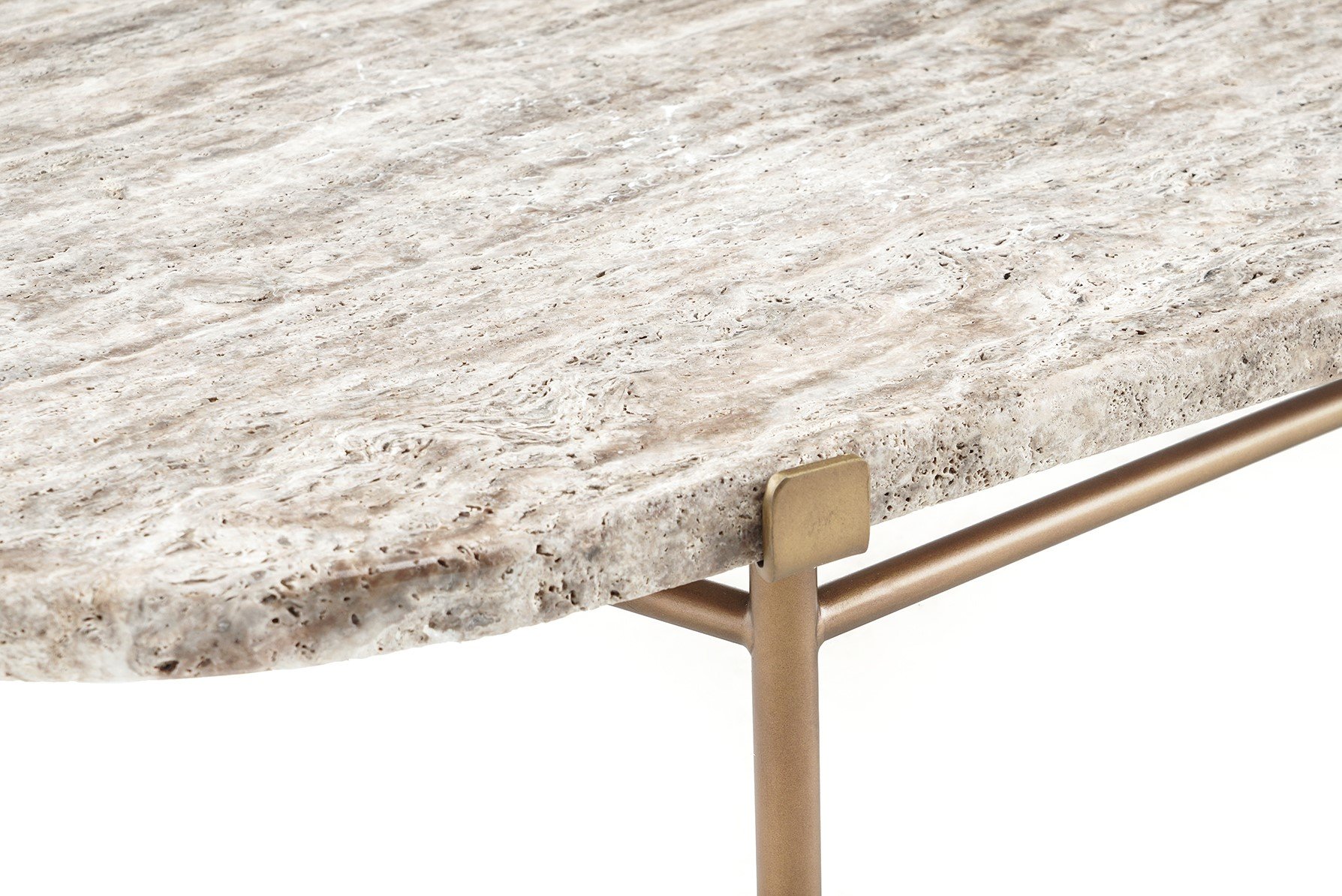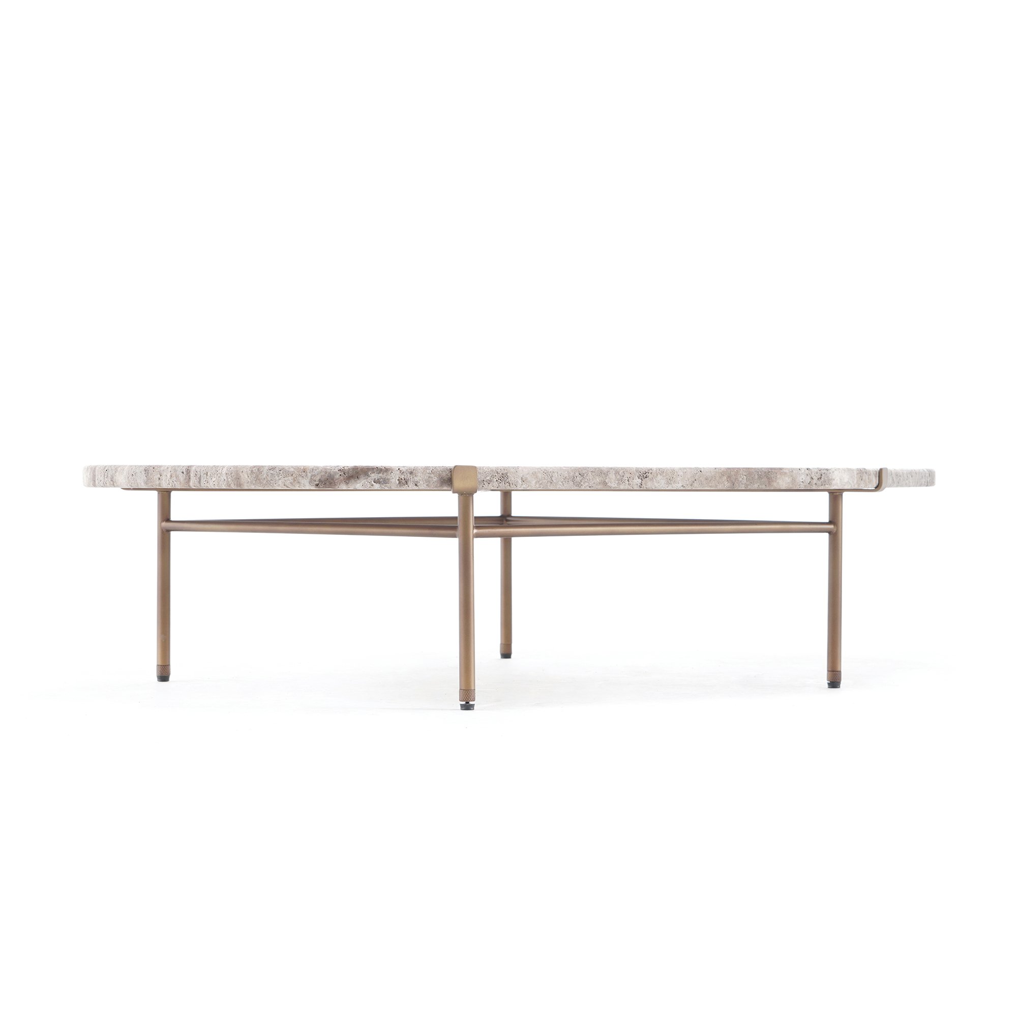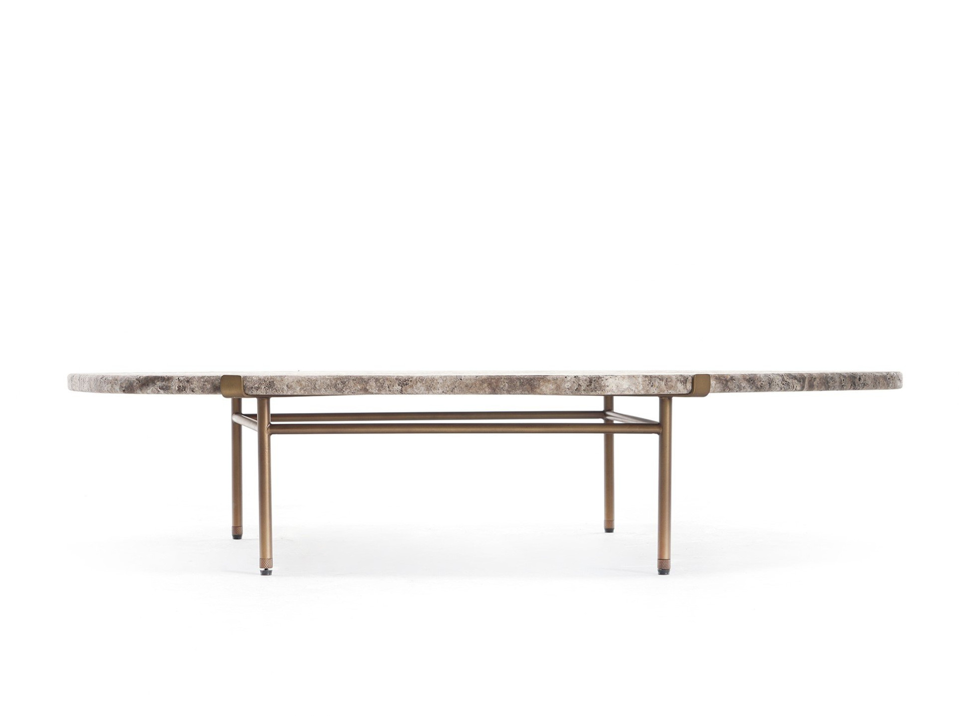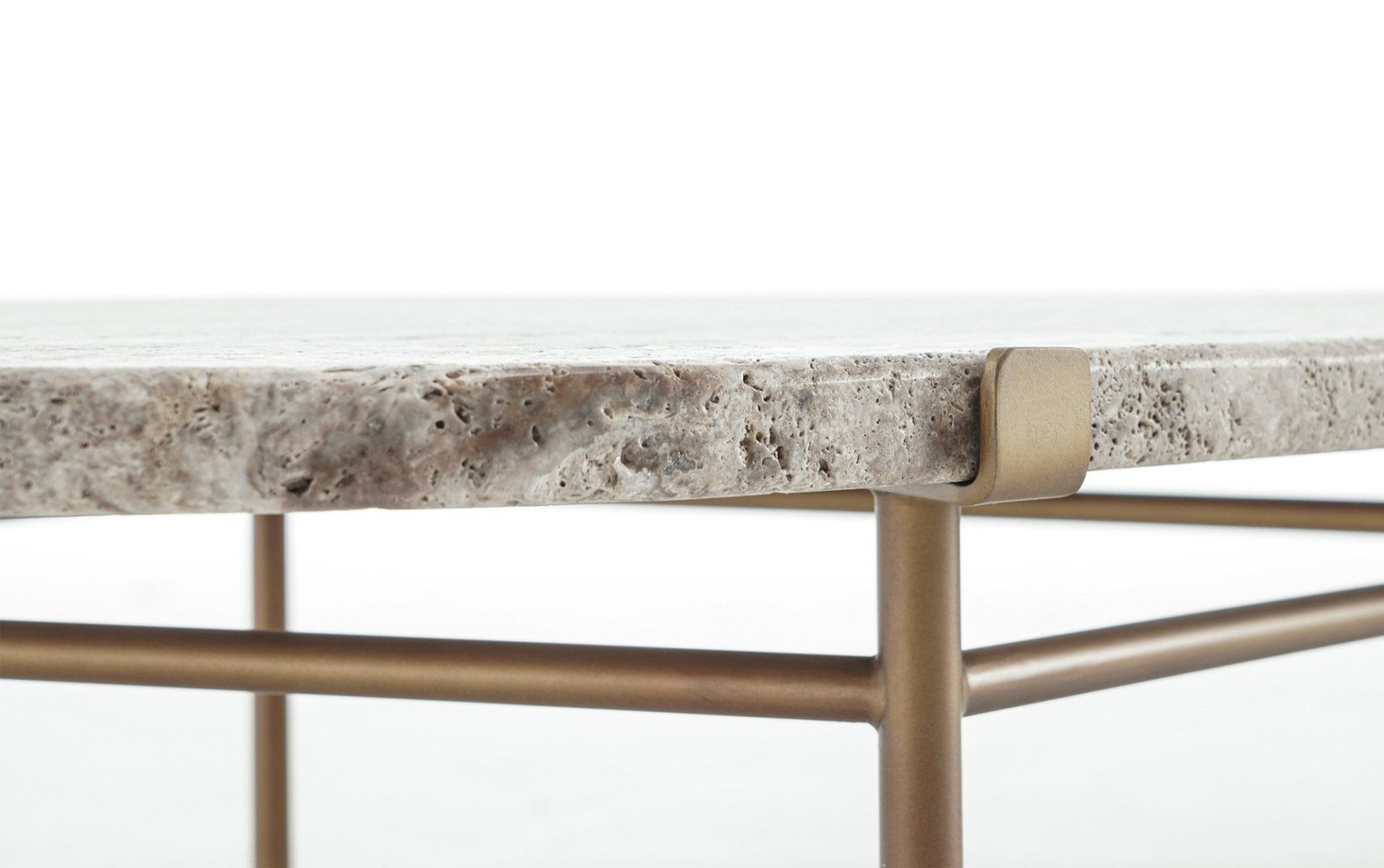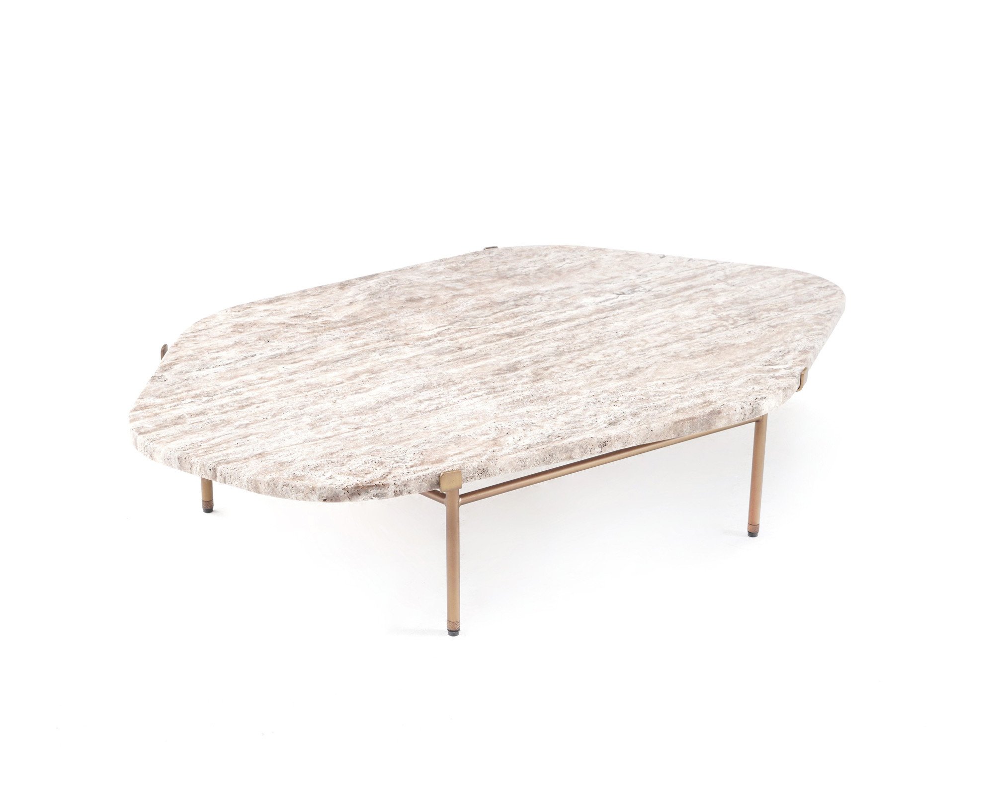 Topped with an amorphous stone slab, the Island Coffee Table determines the feel of the ambiance according to the type of natural stone used. With travertine, it graciously blends into any furniture setting without being noted. With marble, it becomes the predominant element in a room. Drawing inspiration from solitaire ring mounting, the light metal base delicately elevates the stone slab to create a hovering effect. A myriad of marble and matching metal color options help establish the accent needed in any living room.