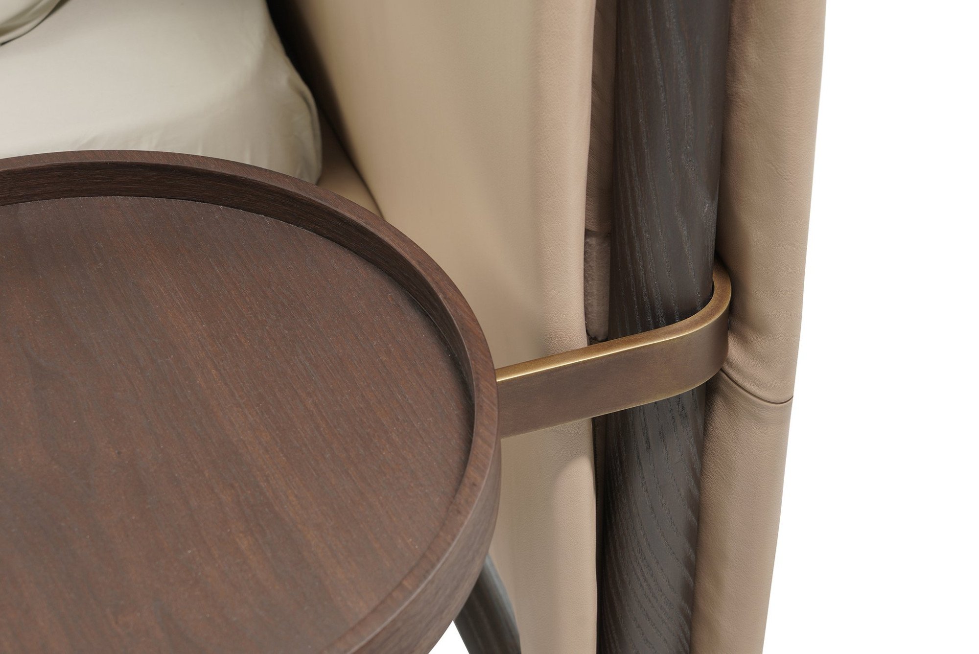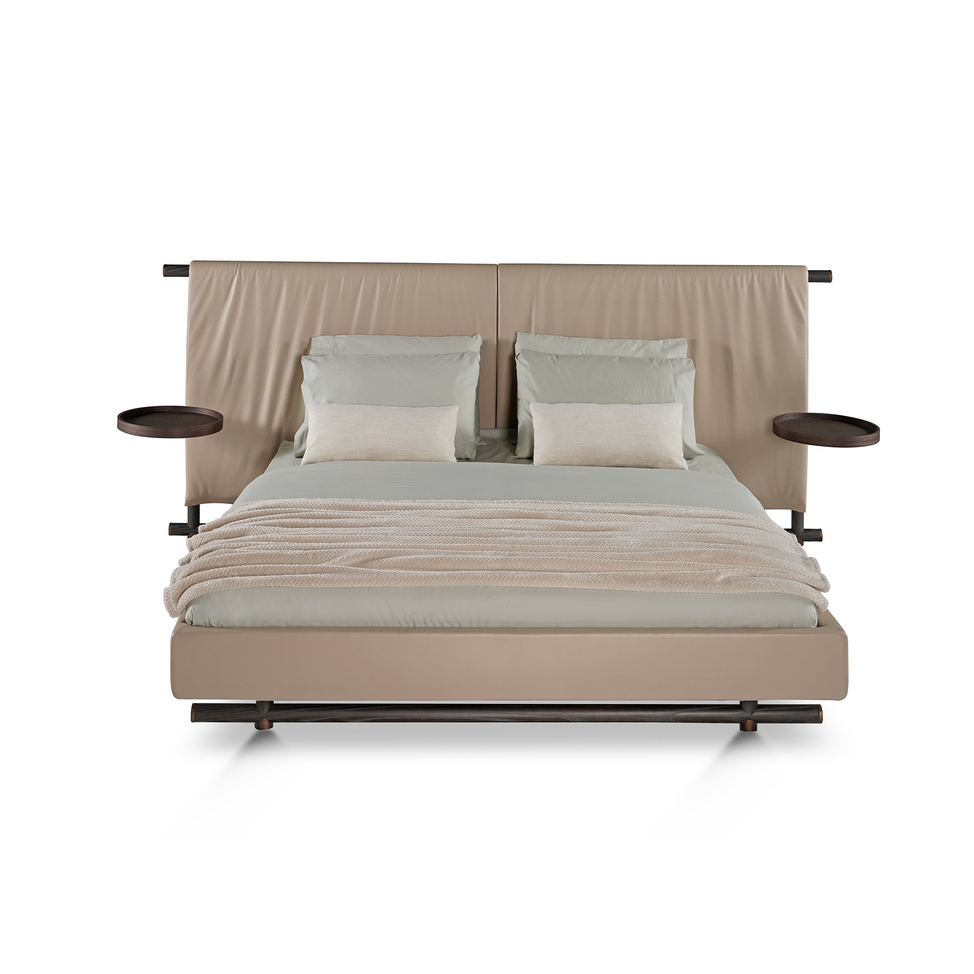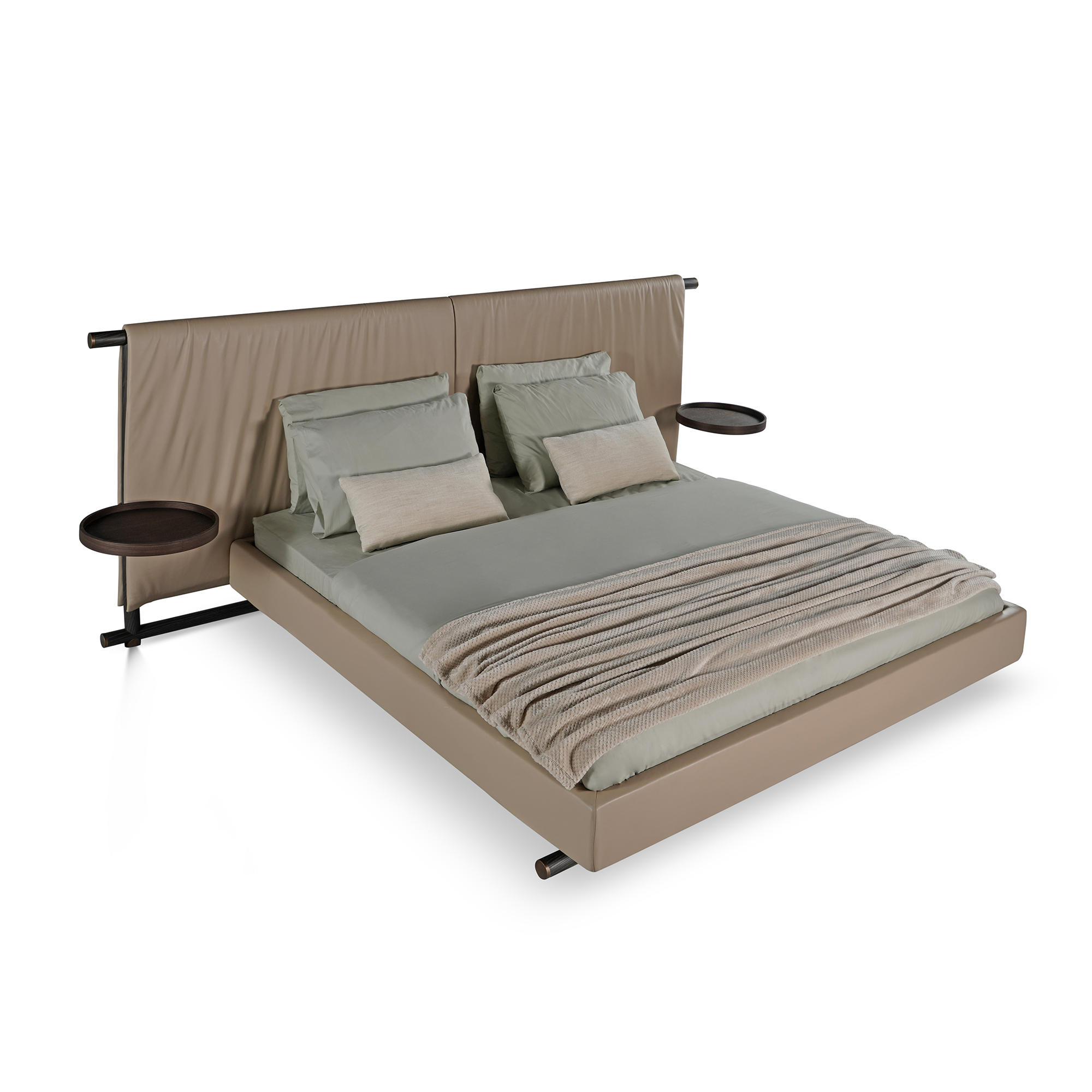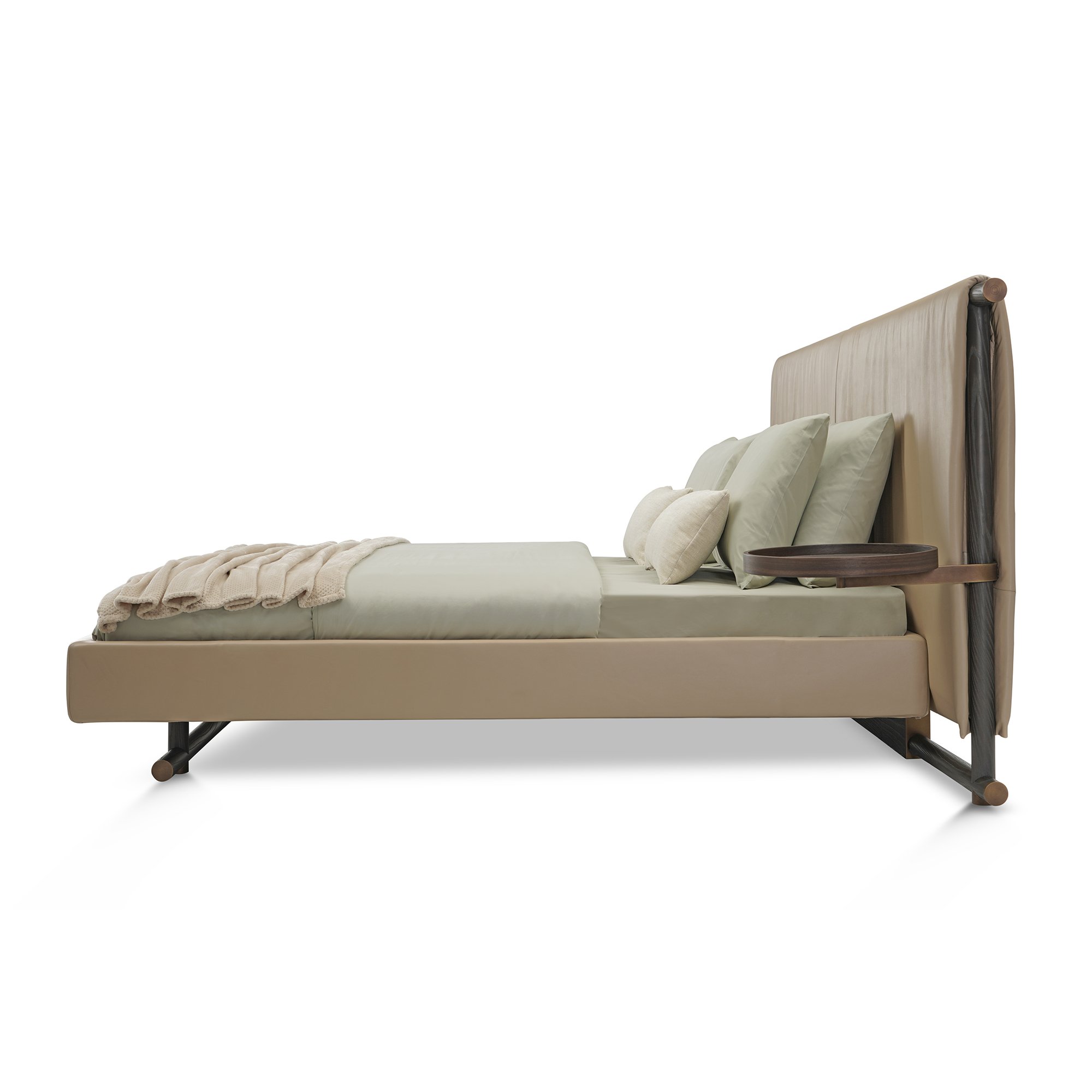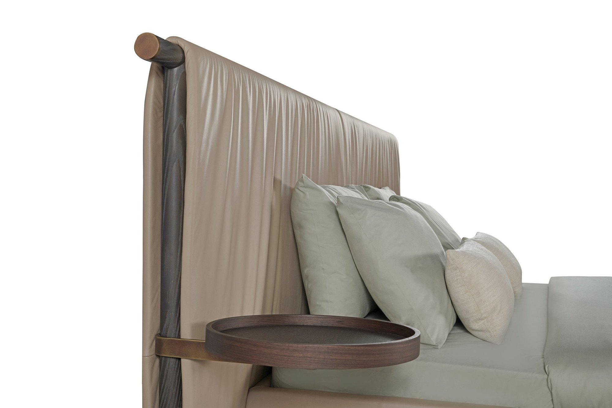 The Wabi-Sabi philosophy of Zen minimalism leaches in as the padded comforter hangs loosely on the headboard structure of the Kimono Bed, expressing simplicity, imperfection, subtleness, and a sense of prudent beauty, the traits that the Japanese design builds on. Two circular fixed trays fasten onto the headboard with lean metal junctions to create instant carriers on both sides, fit for lightweight accessories such as watches, phones, and jewelry. Upholstery, wood, and metal elements have diverse color/ texture options.