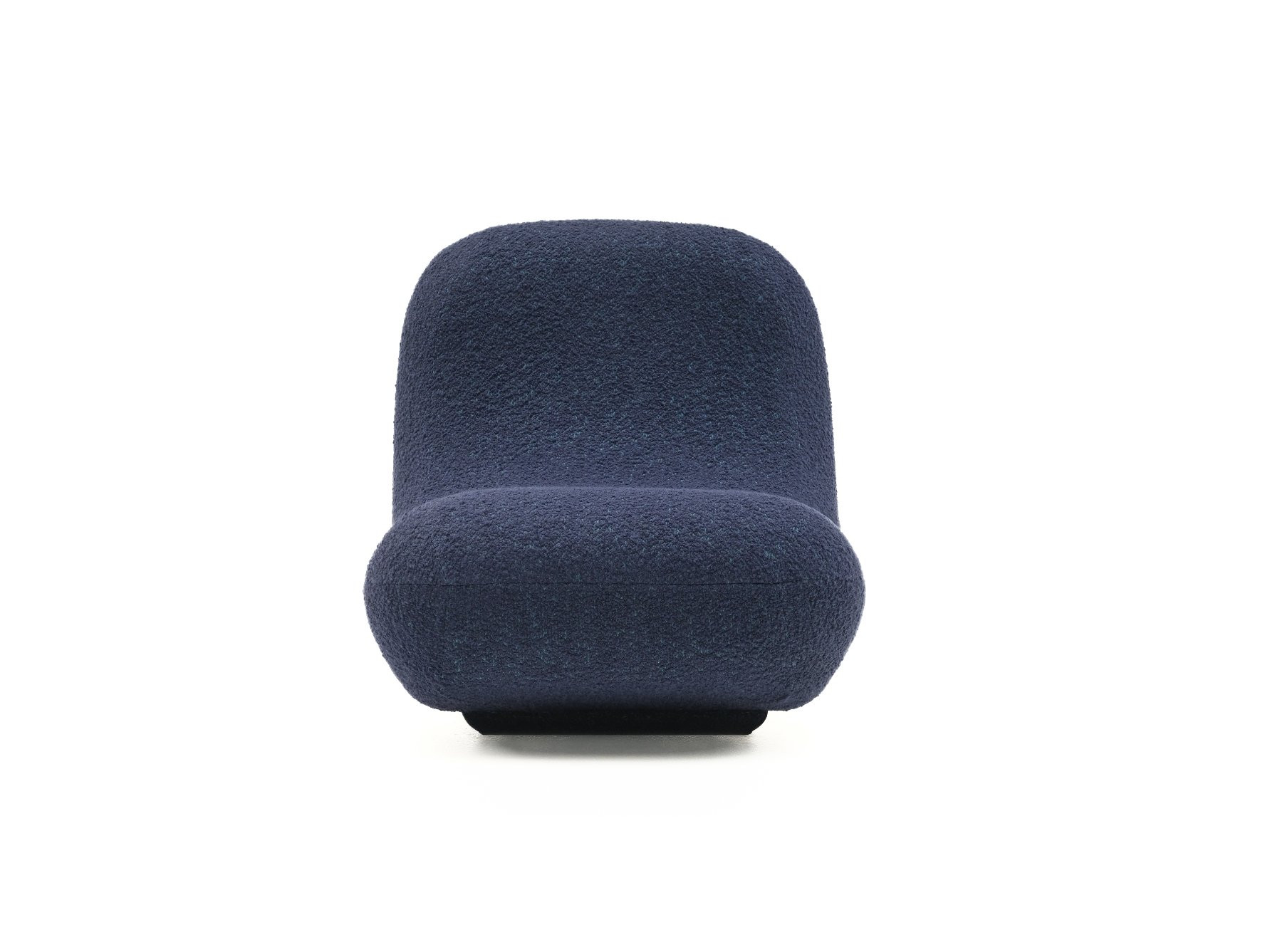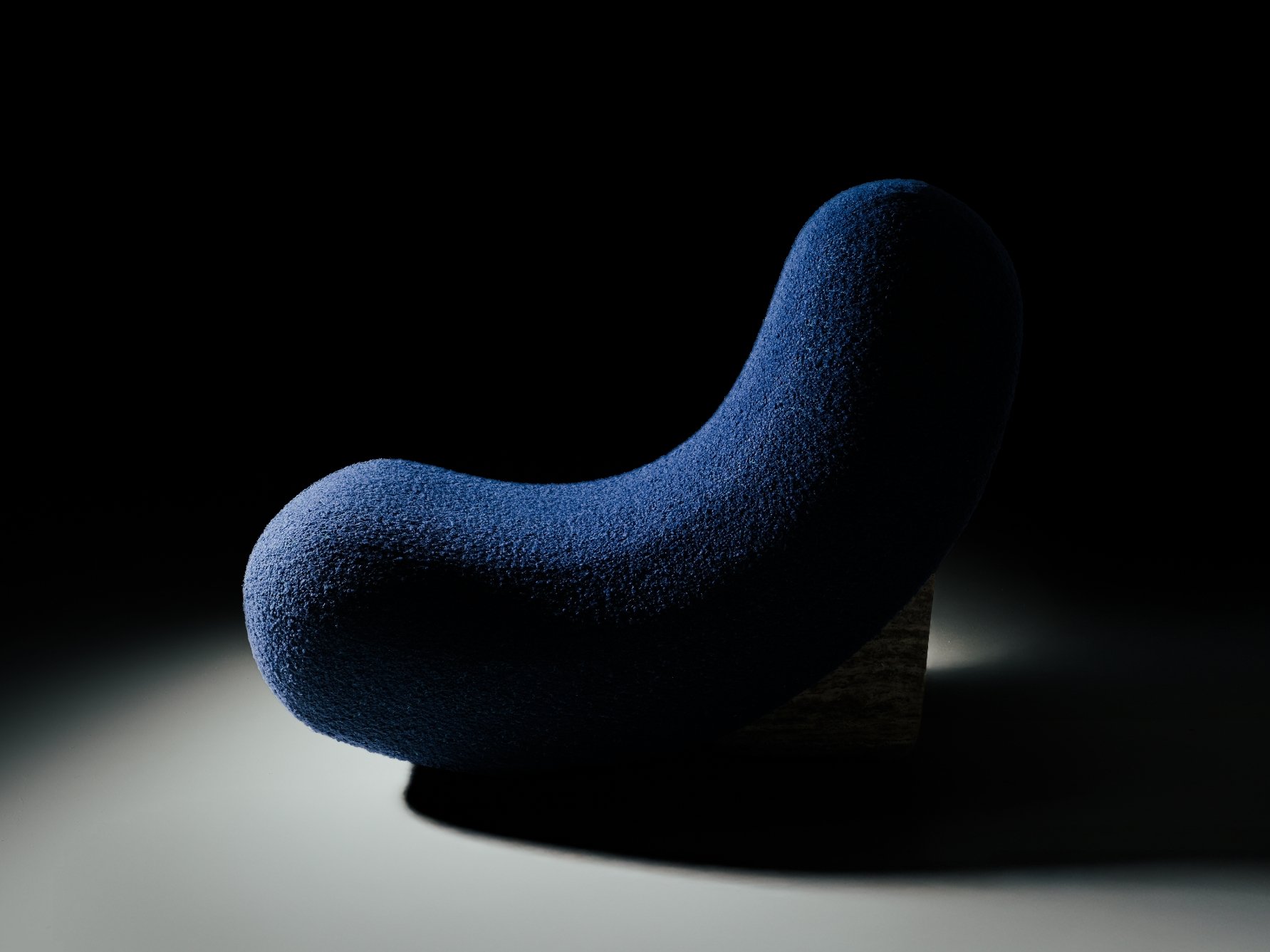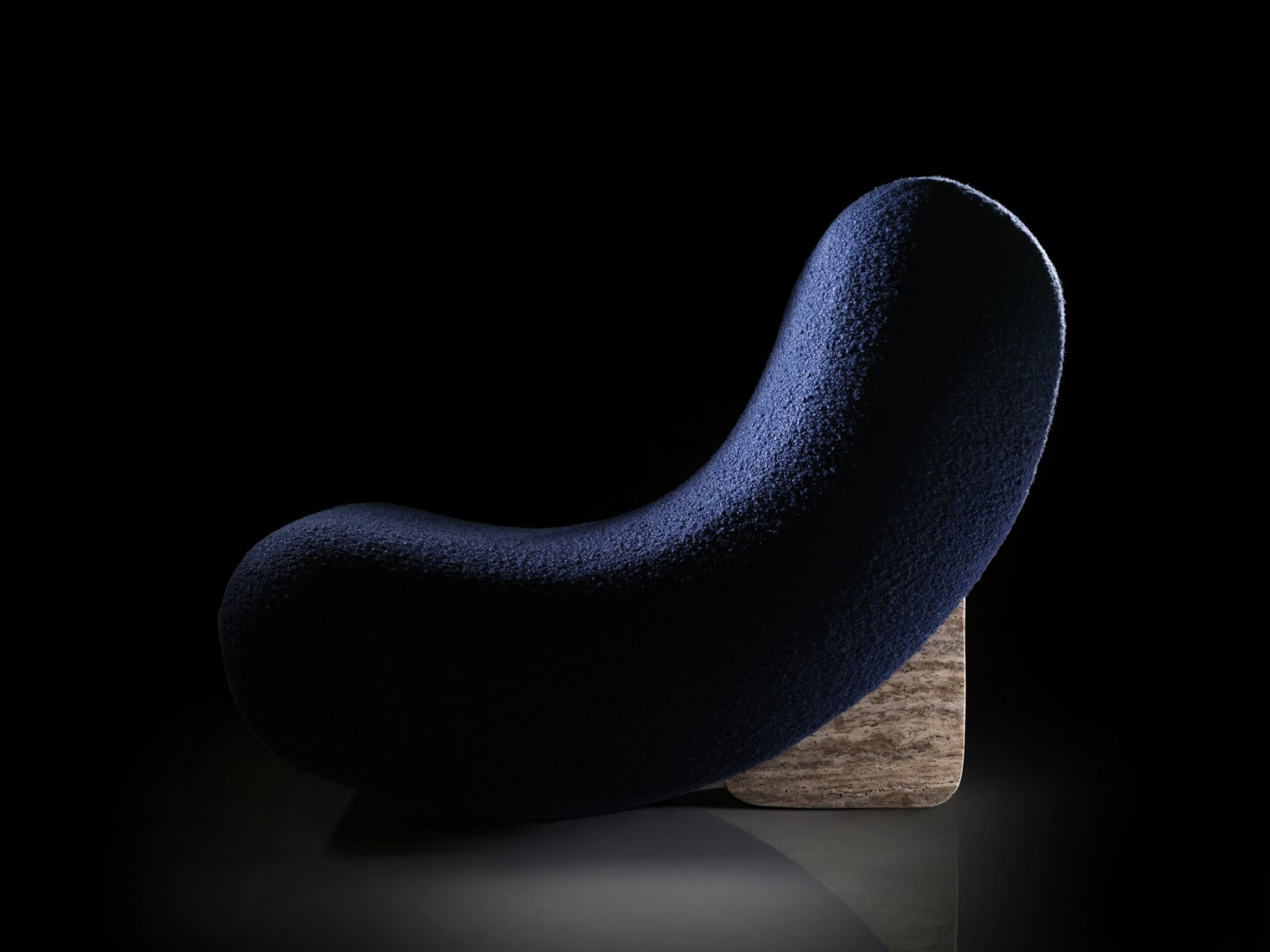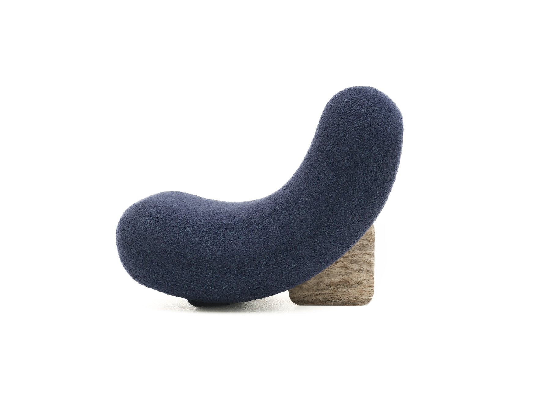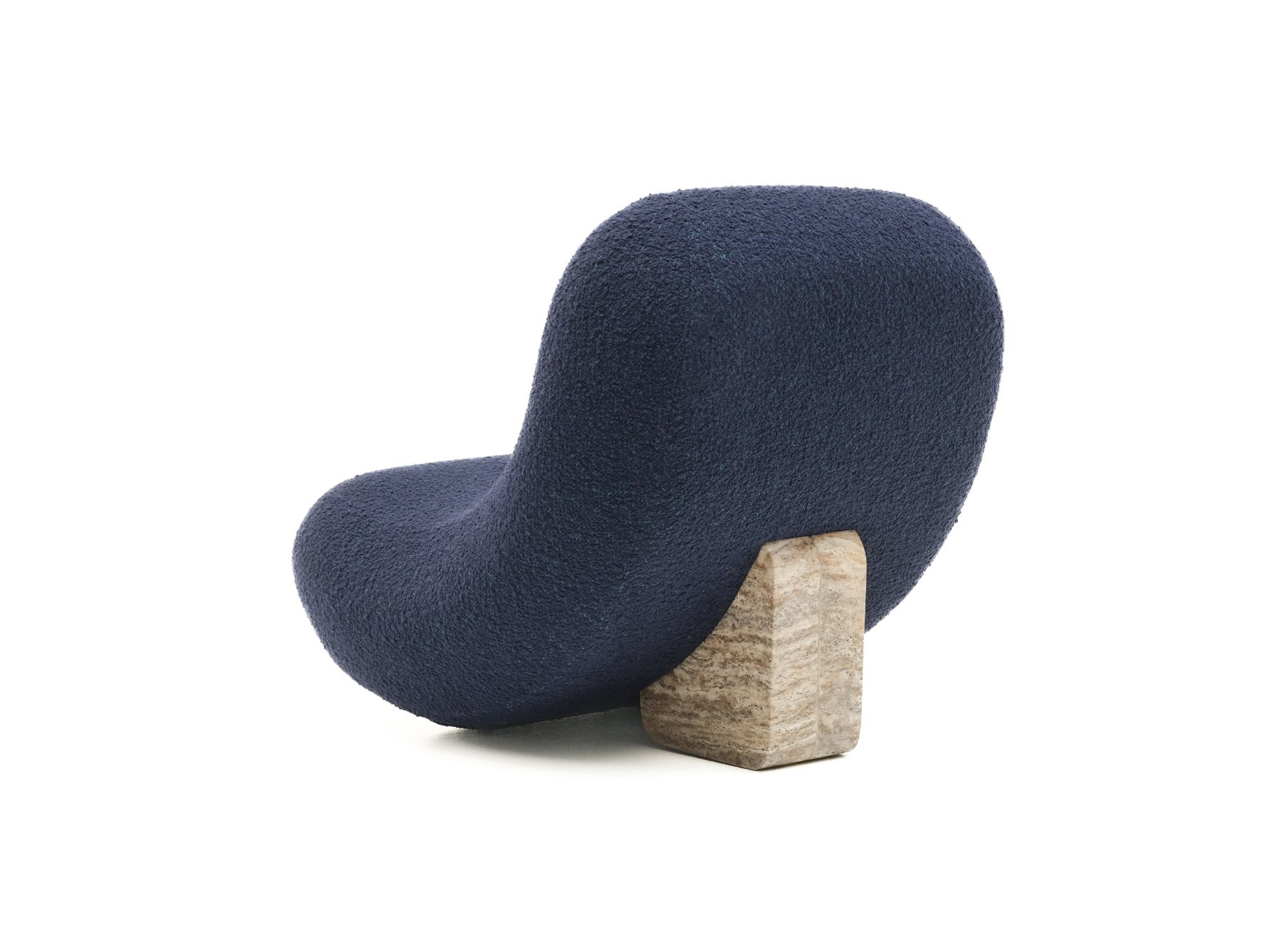 The Nami Armchair feels like a Pause in Motion, captured in perfect harmony. Its fabric flows in a smooth curve, offering a sense of weightlessness. Anchored by travertine legs, it balances between comfort and artistry, inviting both rest and admiration.