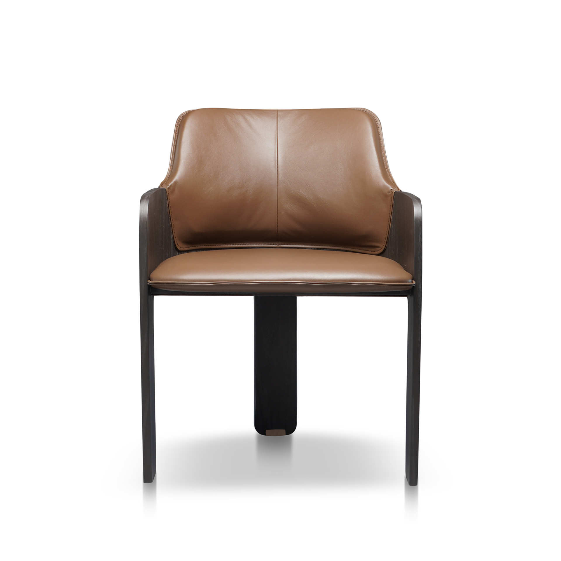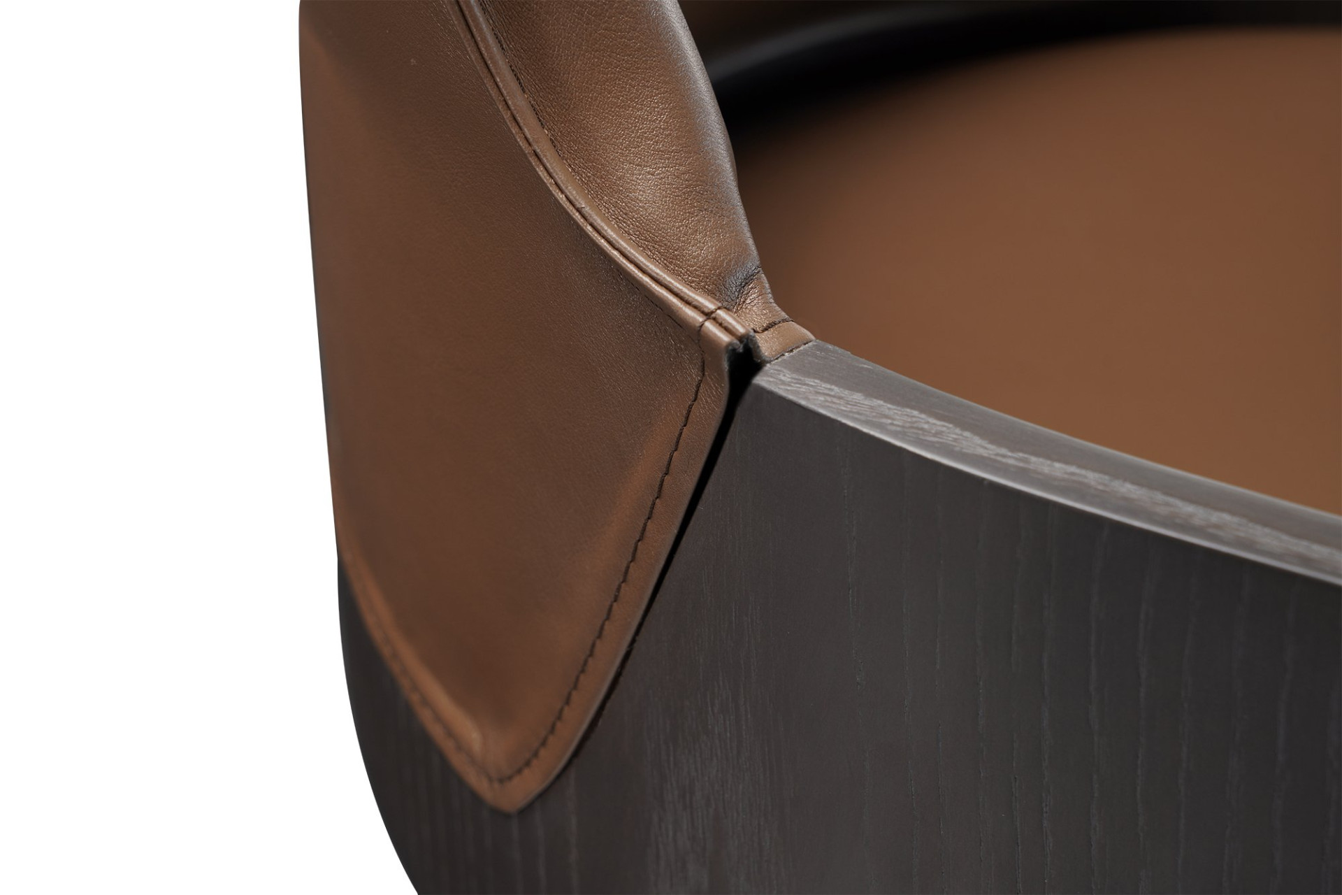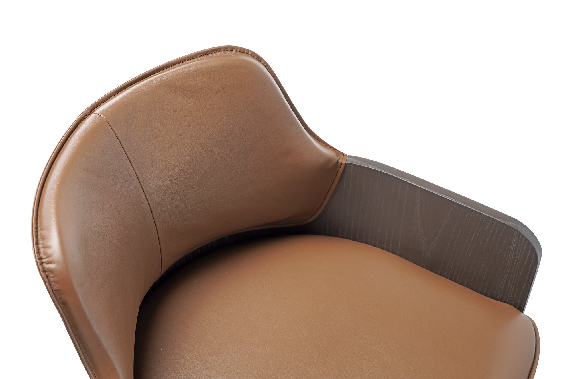 A compact version of the Soul Armchair, and a regular companion of the Leaf and Titano series, Soul Chair suggests a formal yet comfy sitting experience. An impeccably secure and sound product, the Soul Chair demonstrates the perfect harmony of three different materials used in its construction. The wood-veneered plywood crust, which enclaves a metal crescent frame, constructs the main character of the chair. Meticulously stitched and padded backrest, which requires excellent leather craftsmanship, comes in various leather and nubuck alternatives, whereas the seating pad can be fabric or leather. An elegant metal stripe detail mounted on the back foot adds extra gleam to the design.