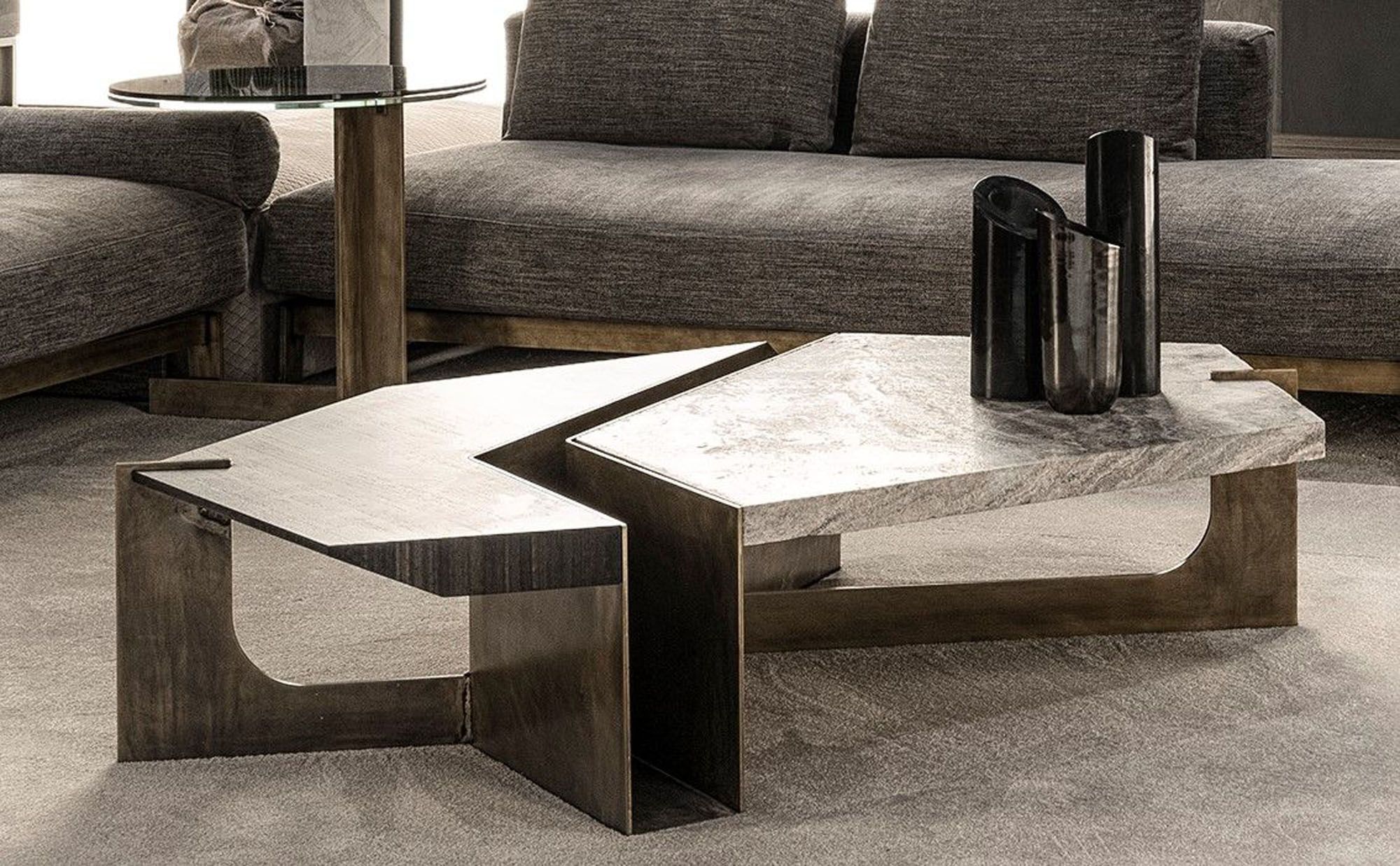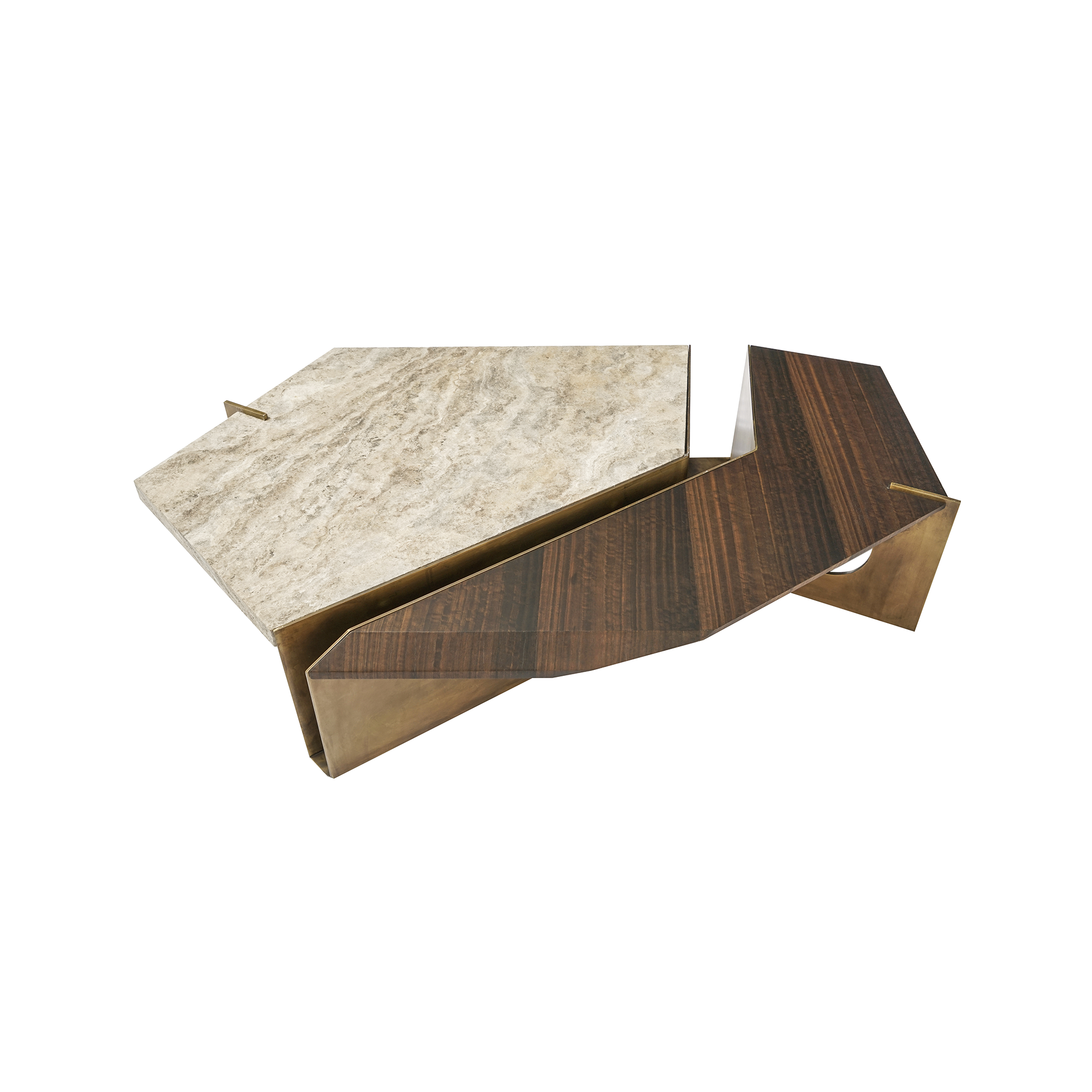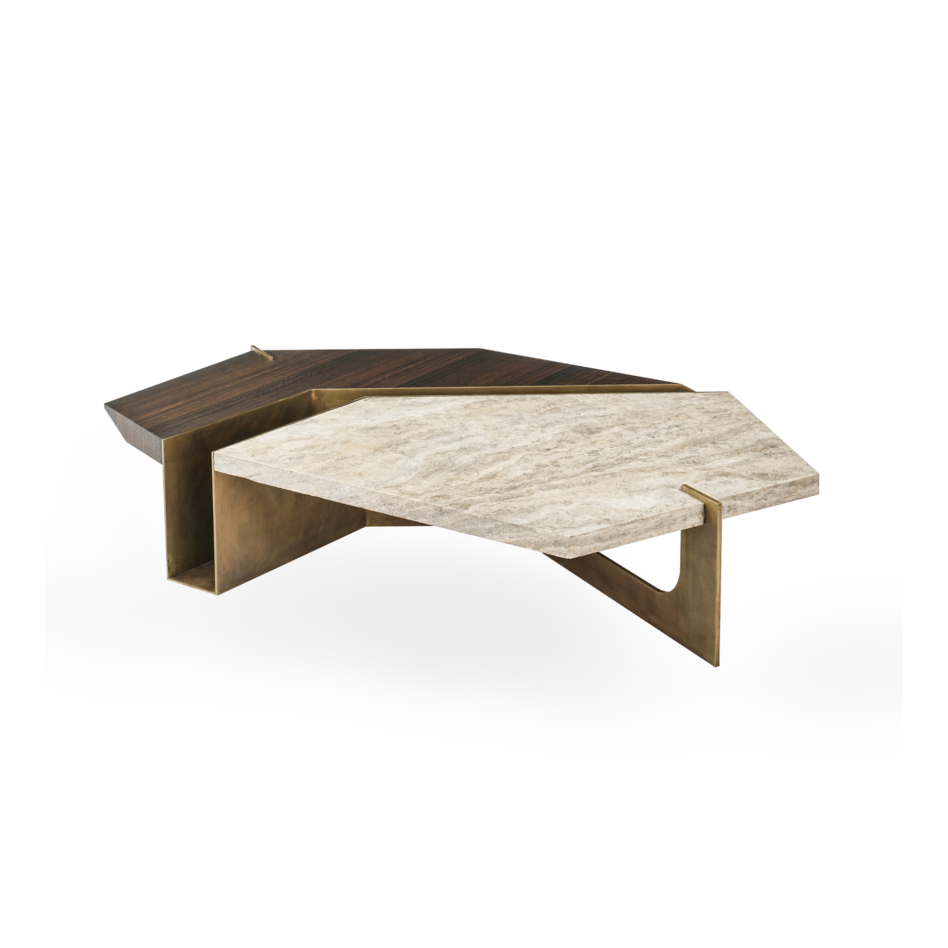 Authentic lines makes everything unique. Stratos combines eucalyptus covers and aged brass with travertine marble shapes to find an unmatched harmony expressed in authentic lines.