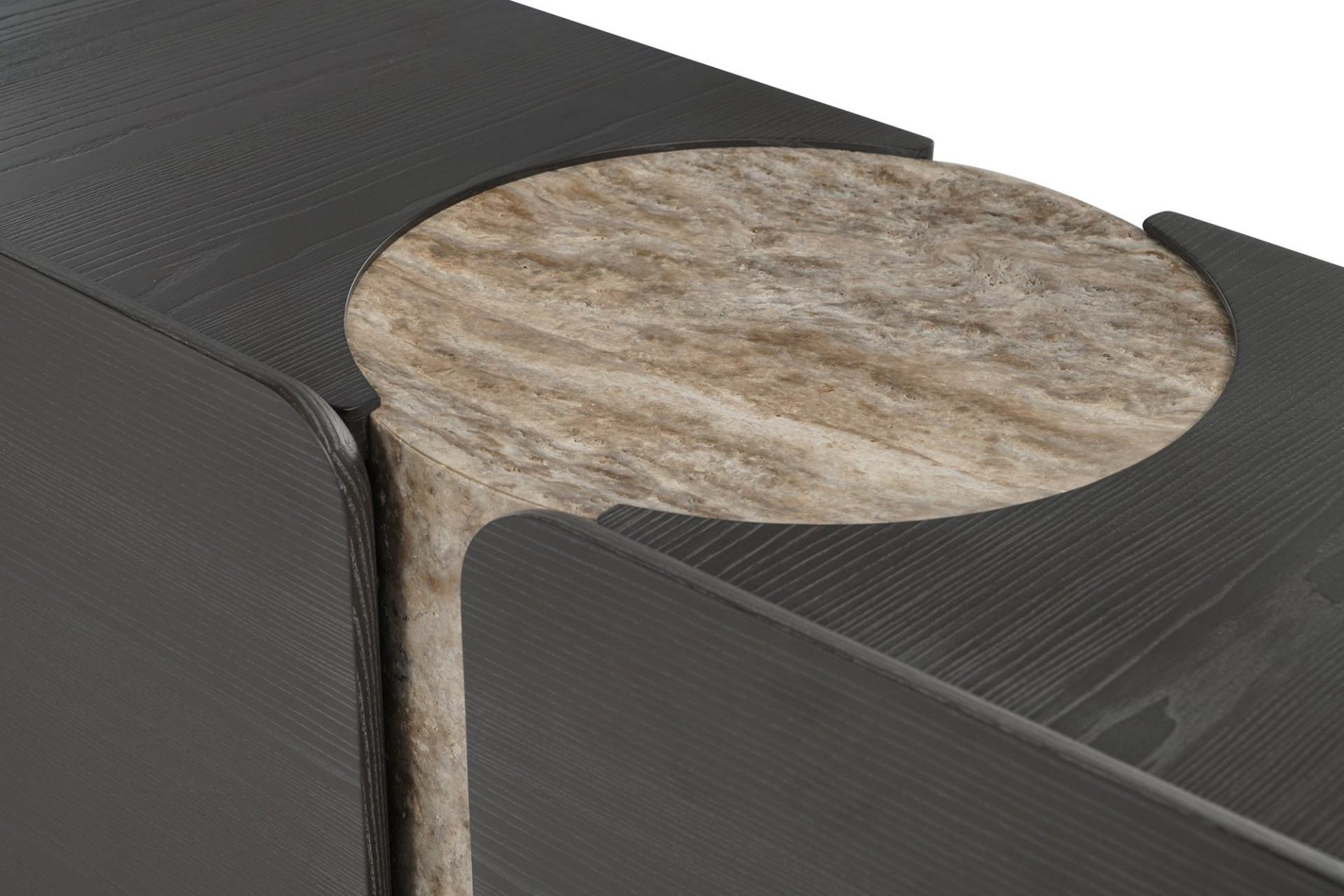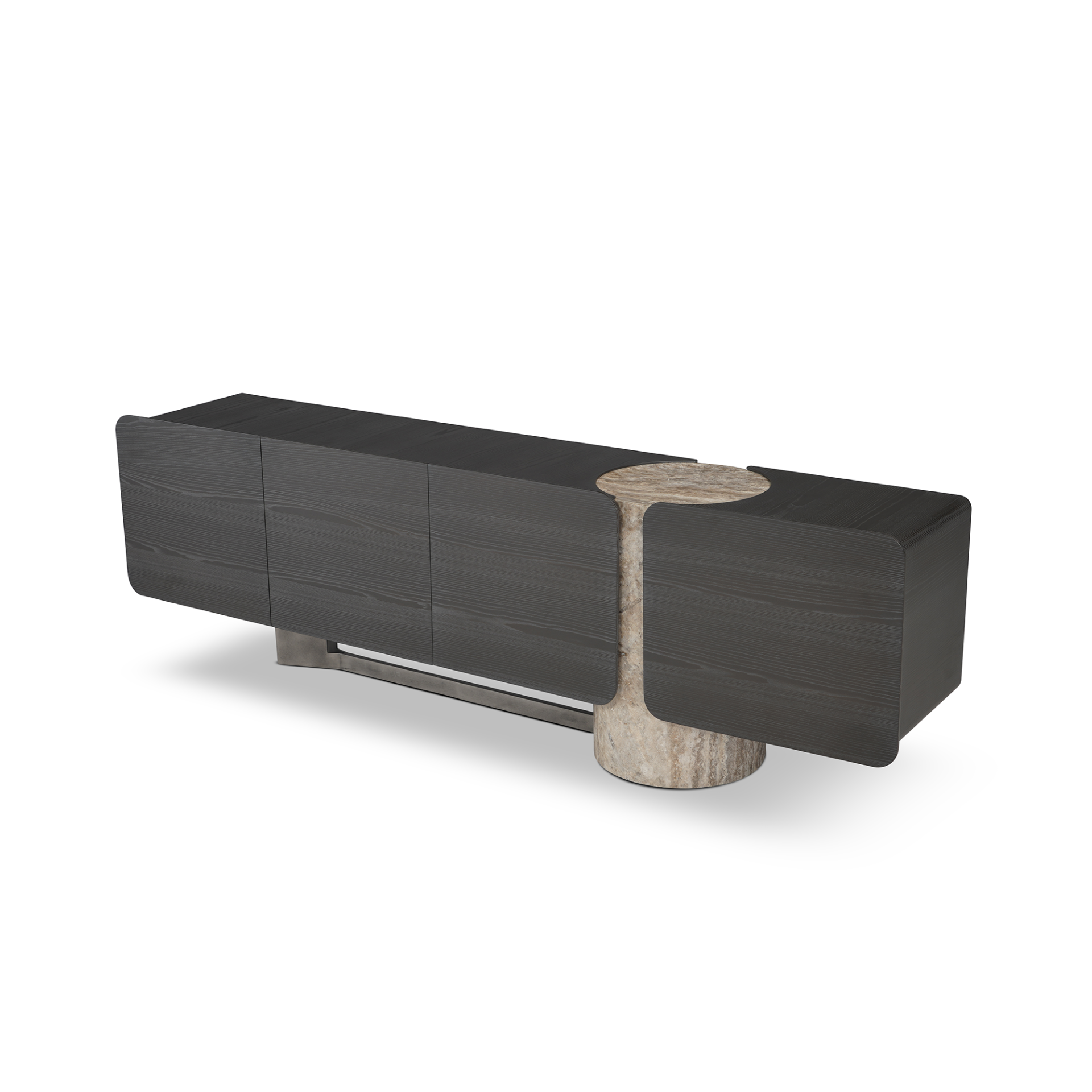 Although it exhibits the overpowering asymmetrical presence and the keen linearity of the collection, Titano Sideboard has a rather tactical standpoint compared to the other members or the series. The cabinet body combines two uneven cuboid blocks meshed around the hollowed-out stone pillar. A rigorously curated void between the cabinet doors exposes the tangible quality of the natural stone pillar, and the recessed section of the top end brings extra function to the sideboard. A metal leg supports the extended wing that conceals an additional unit with a drawer. The glaring, almost blady nature of the swallowtail leg contrasts and balances the round corners and the sanded surface of the wooden cabinet. All materials are locally produced; the stone pillar comes in travertine and marble options. The sanded solid wood and metal surfaces have numerous color alternatives.