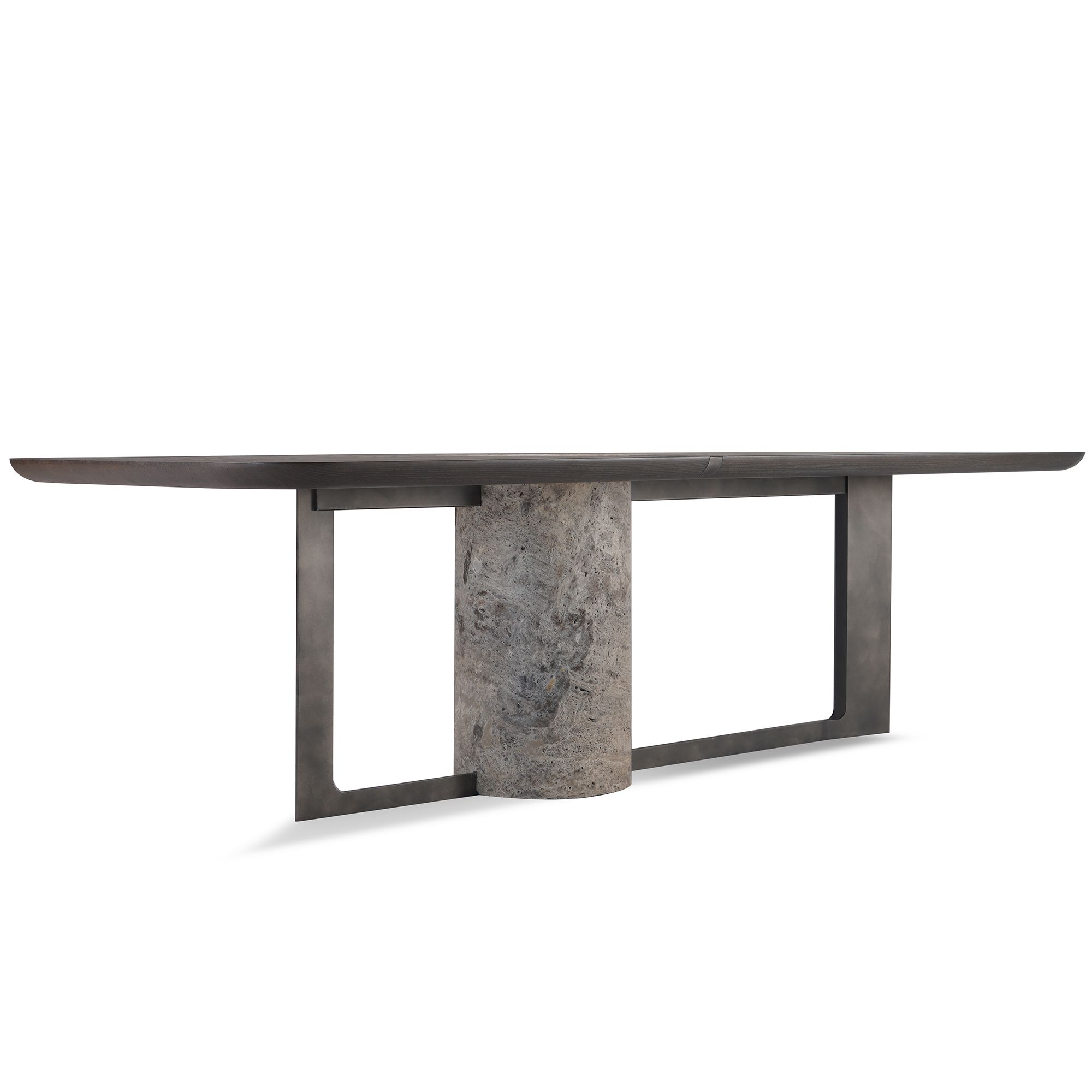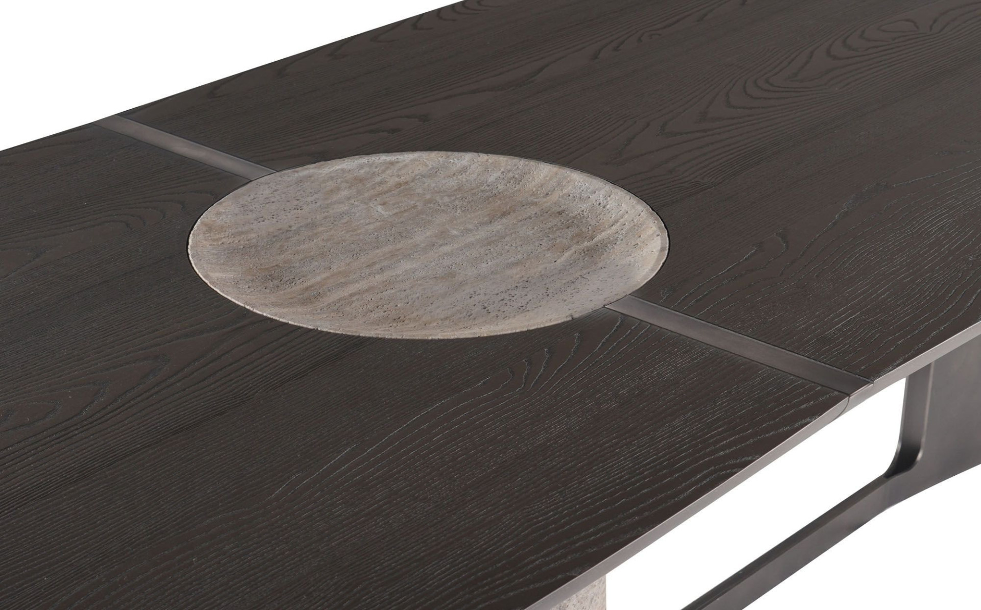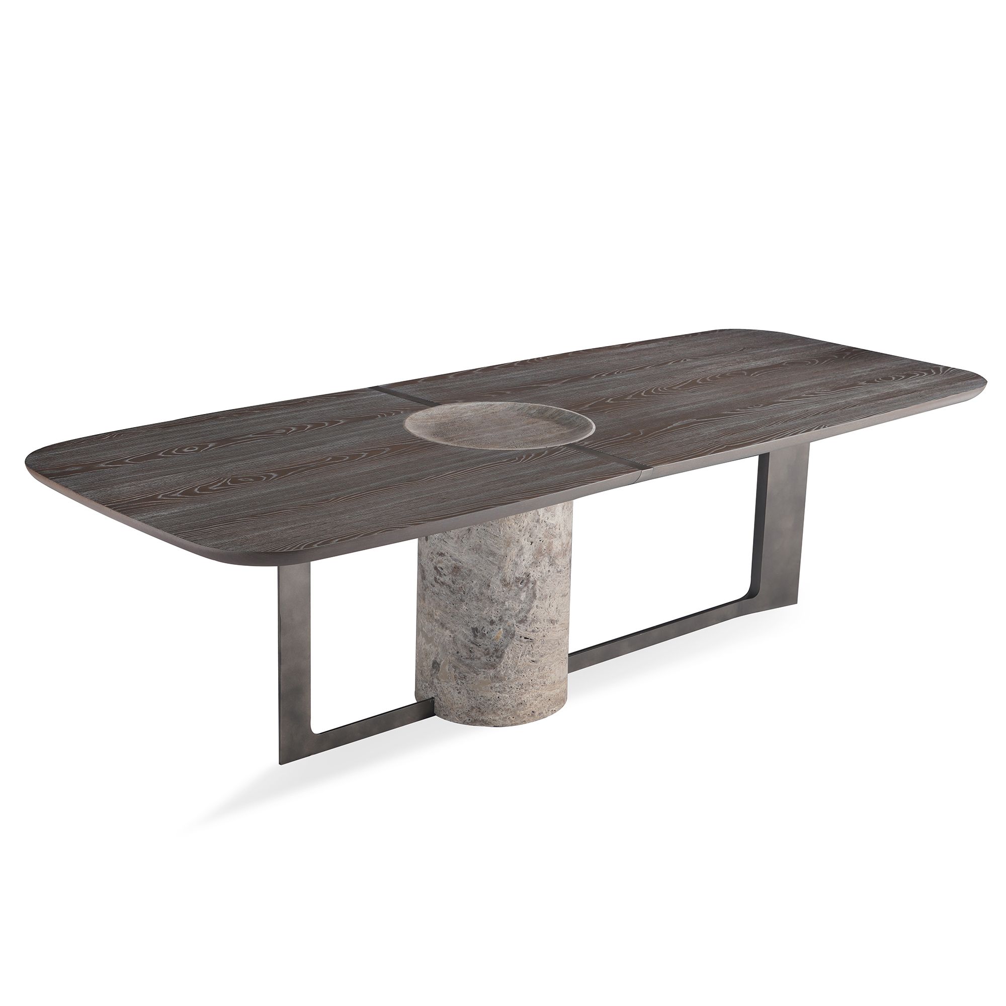 The grandiose abundance and staggering details of Titano Table reflect the spirited substance of the Titano Collection. The tabletop splits into uneven pieces and then unites around the hollowed-out natural stone pillar, which constitutes the primary support of the solid wood top. A lean metal belt wraps up and ties the junction. The metal sheet base works as an additional support to the tabletop besides framing the whole unit. The top end of the stone pillar emerges as a recessed, bowl-like setup to bring added function and unrivaled aesthetics to the composition. All materials are locally produced; the stone pillar comes in travertine and marble options. The sanded solid wood and metal surfaces have numerous color alternatives.