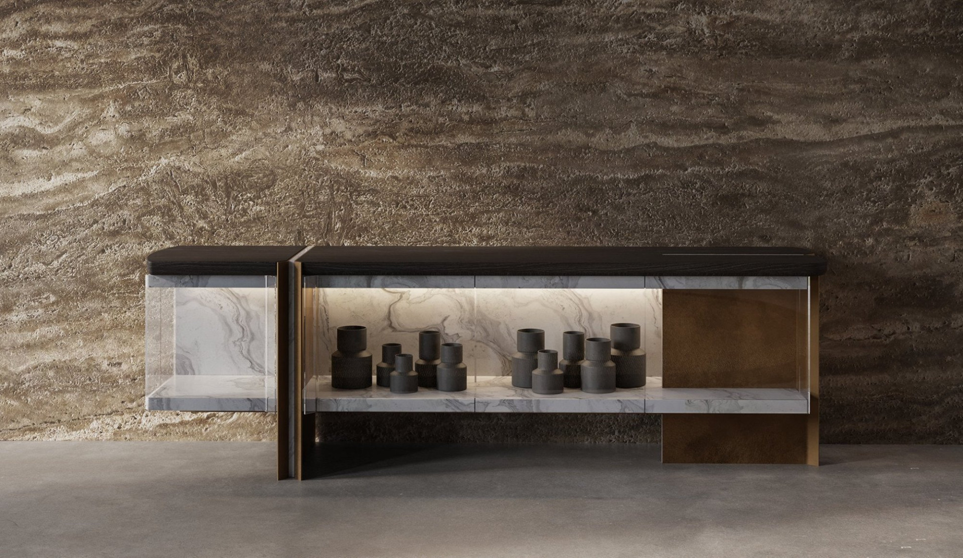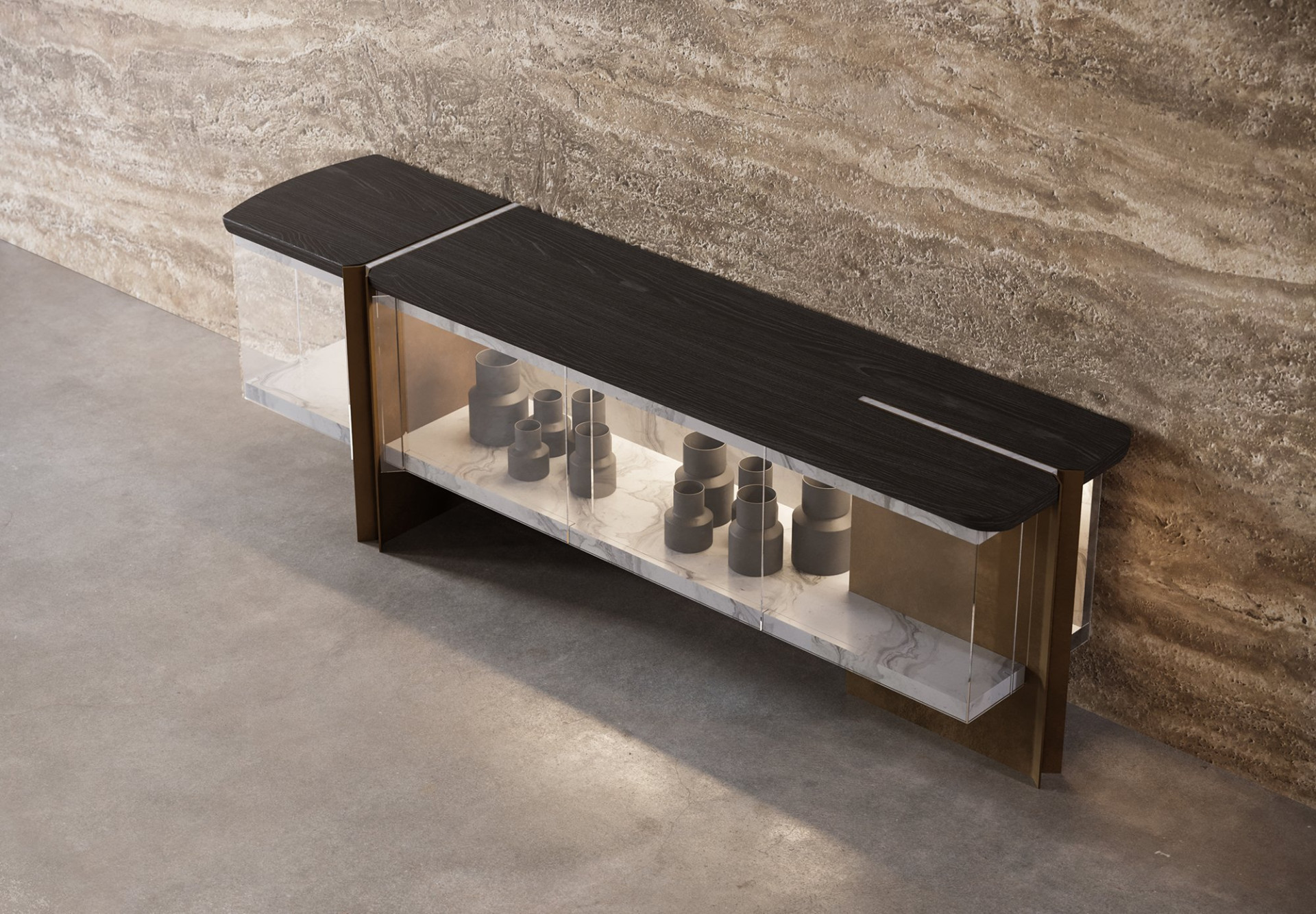 Malzemeler, konsolun iç alanını güçlendiren güzel bir yansıma etkisi yaratır.